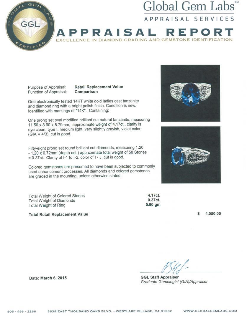 One electronically tested 14KT white gold ladies cast tanzanite and diamond ring with a bright polish finish. Identified with markings of "14K". Condition is new. Containing: One prong set oval modified brilliant cut natural tanzanite, measuring 11.50 x 8.90 x 5.79mm, approximate weight of 4.17ct., clarity is eye clean, type I, medium light, very slightly grayish, violet color, (GIA V 4/3), cut is good. Fifty-Eight prong set round brilliant cut diamonds, measuring 1.20 - 1.20 x 0.72mm (depth est.) approximate total weight of 58 Stones = 0.37ct. . Clarity: I-1 to I-2. Color: I - J, Cut is Good. Colored gemstones are presumed to have been subjected to commonly used enhancement processes. All diamonds and colored gemstones are graded in the mounting, unless otherwise stated.. Total Weight of Colored Stones 4.17ct.. Total Weight of Diamonds 0.37ct.. Total Weight of Ring 5.90 grams. GGL Appraised at $4,050.00.