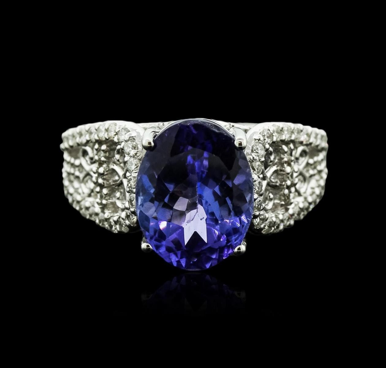One electronically tested 14KT white gold ladies cast tanzanite and diamond ring with a bright polish finish. Identified with markings of "14K". Condition is new. Containing: One prong set oval modified brilliant cut natural tanzanite, measuring 11.50 x 8.90 x 5.79mm, approximate weight of 4.17ct., clarity is eye clean, type I, medium light, very slightly grayish, violet color, (GIA V 4/3), cut is good. Fifty-Eight prong set round brilliant cut diamonds, measuring 1.20 - 1.20 x 0.72mm (depth est.) approximate total weight of 58 Stones = 0.37ct. . Clarity: I-1 to I-2. Color: I - J, Cut is Good. Colored gemstones are presumed to have been subjected to commonly used enhancement processes. All diamonds and colored gemstones are graded in the mounting, unless otherwise stated.. Total Weight of Colored Stones 4.17ct.. Total Weight of Diamonds 0.37ct.. Total Weight of Ring 5.90 grams. GGL Appraised.