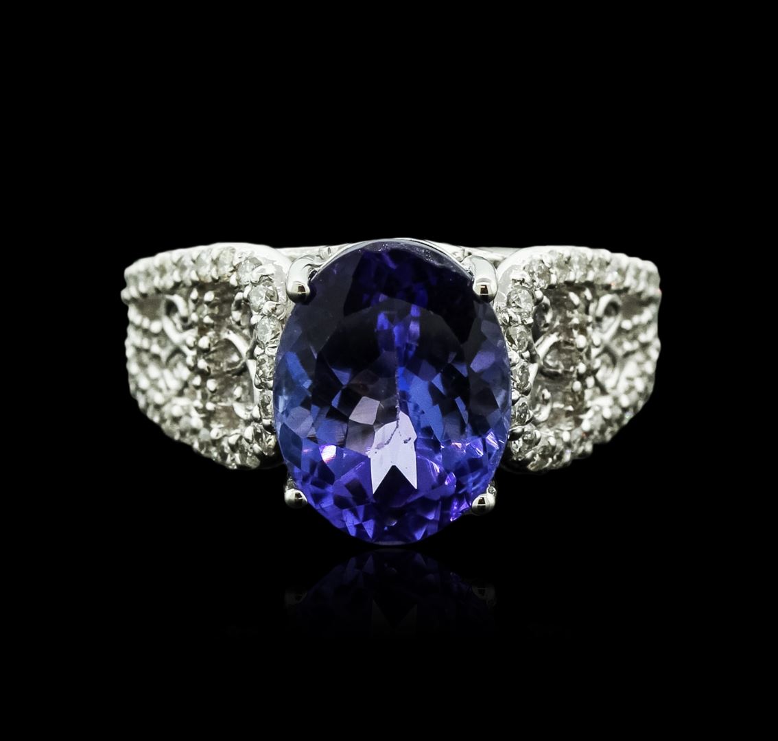 One electronically tested 14KT white gold ladies cast tanzanite and diamond ring with a bright polish finish. Identified with markings of "14K". Condition is new. Containing: One prong set oval modified brilliant cut natural tanzanite, measuring 11.50 x 8.90 x 5.79mm, approximate weight of 4.17ct., clarity is eye clean, type I, medium light, very slightly grayish, violet color, (GIA V 4/3), cut is good. Fifty-Eight prong set round brilliant cut diamonds, measuring 1.20 - 1.20 x 0.72mm (depth est.) approximate total weight of 58 Stones = 0.37ct. . Clarity: I-1 to I-2. Color: I - J, Cut is Good. Colored gemstones are presumed to have been subjected to commonly used enhancement processes. All diamonds and colored gemstones are graded in the mounting, unless otherwise stated.. Total Weight of Colored Stones 4.17ct.. Total Weight of Diamonds 0.37ct.. Total Weight of Ring 5.90 grams. GGL Appraised at $4,050.00.