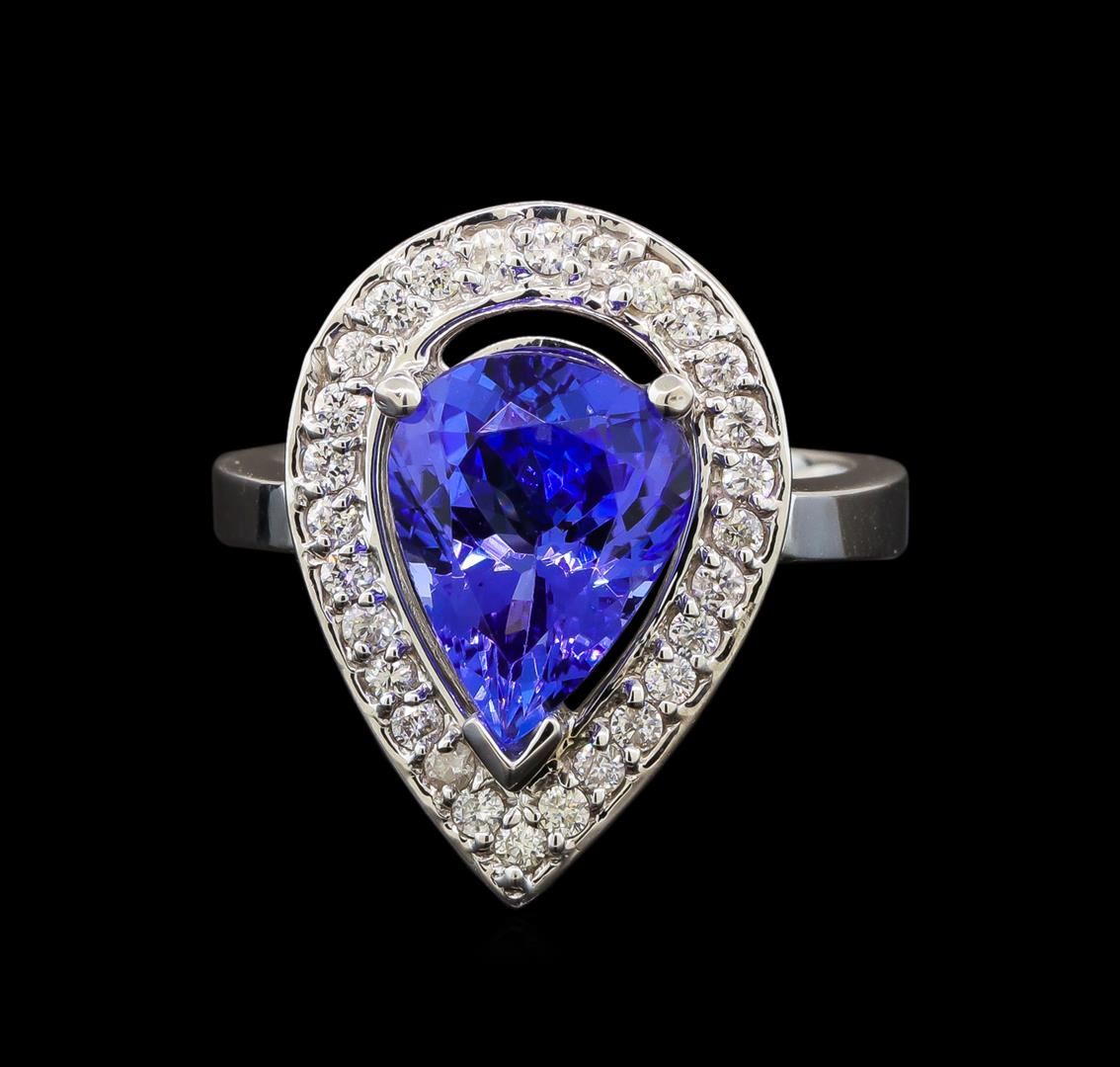 One electronically tested 14KT white gold ladies cast tanzanite and diamond ring with a bright polish finish. Identified with markings of "K14". Condition is new. Containing: One prong set pear modified brilliant cut natural tanzanite, measuring 12.10 x 8.90 x 5.79mm, approximate weight of 4.18ct., clarity is eye clean, type I, medium light, very slightly grayish, violet color, (GIA V 4/3), cut is good. Twenty-Eight prong set round brilliant cut diamonds, measuring 1.50 - 1.50 x 0.90mm (depth est.) approximate total weight of 28 Stones = 0.34ct. Clarity: SI-1 to I-1. Color: H - I, Cut is Good. Colored gemstones are presumed to have been subjected to commonly used enhancement processes. All diamonds and colored gemstones are graded in the mounting, unless otherwise stated. Total Weight of Colored Stones 4.18ct. Total Weight of Diamonds 0.34ct. Total Weight of Ring 7.60 grams. GGL Appraised at $5,125.00.