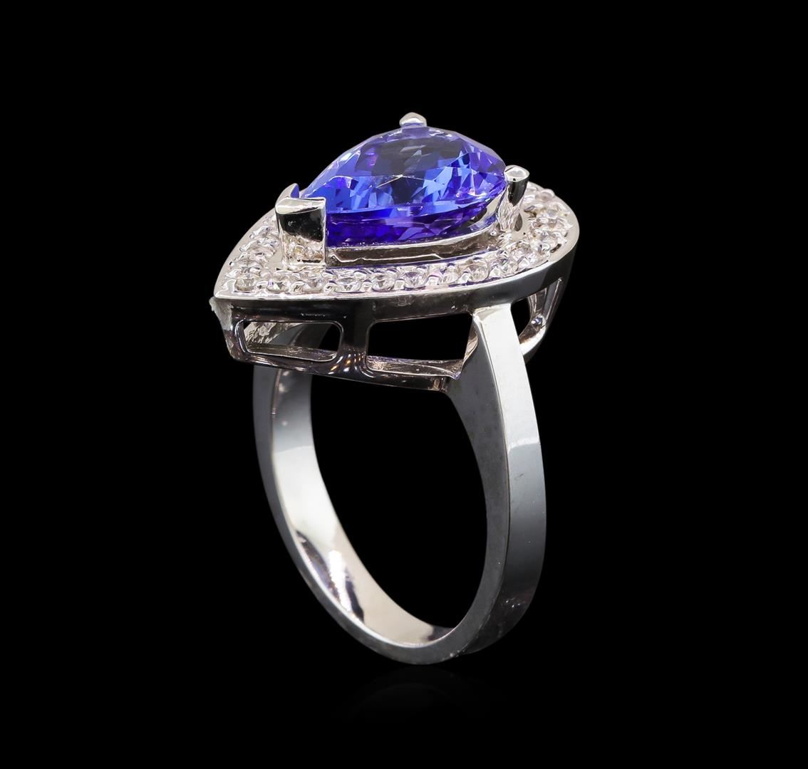 One electronically tested 14KT white gold ladies cast tanzanite and diamond ring with a bright polish finish. Identified with markings of "K14". Condition is new. Containing: One prong set pear modified brilliant cut natural tanzanite, measuring 12.10 x 8.90 x 5.79mm, approximate weight of 4.18ct., clarity is eye clean, type I, medium light, very slightly grayish, violet color, (GIA V 4/3), cut is good. Twenty-Eight prong set round brilliant cut diamonds, measuring 1.50 - 1.50 x 0.90mm (depth est.) approximate total weight of 28 Stones = 0.34ct. Clarity: SI-1 to I-1. Color: H - I, Cut is Good. Colored gemstones are presumed to have been subjected to commonly used enhancement processes. All diamonds and colored gemstones are graded in the mounting, unless otherwise stated. Total Weight of Colored Stones 4.18ct. Total Weight of Diamonds 0.34ct. Total Weight of Ring 7.60 grams. GGL Appraised at $5,125.00.