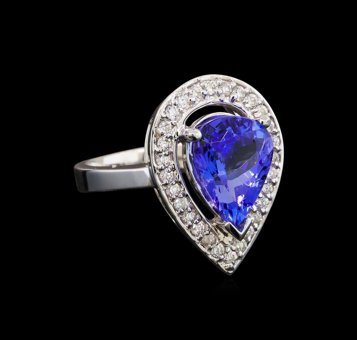 One electronically tested 14KT white gold ladies cast tanzanite and diamond ring with a bright polish finish. Identified with markings of "K14". Condition is new. Containing: One prong set pear modified brilliant cut natural tanzanite, measuring 12.10 x 8.90 x 5.79mm, approximate weight of 4.18ct., clarity is eye clean, type I, medium light, very slightly grayish, violet color, (GIA V 4/3), cut is good. Twenty-Eight prong set round brilliant cut diamonds, measuring 1.50 - 1.50 x 0.90mm (depth est.) approximate total weight of 28 Stones = 0.34ct. Clarity: SI-1 to I-1. Color: H - I, Cut is Good. Colored gemstones are presumed to have been subjected to commonly used enhancement processes. All diamonds and colored gemstones are graded in the mounting, unless otherwise stated. Total Weight of Colored Stones 4.18ct. Total Weight of Diamonds 0.34ct. Total Weight of Ring 7.60 grams. GGL Appraised.