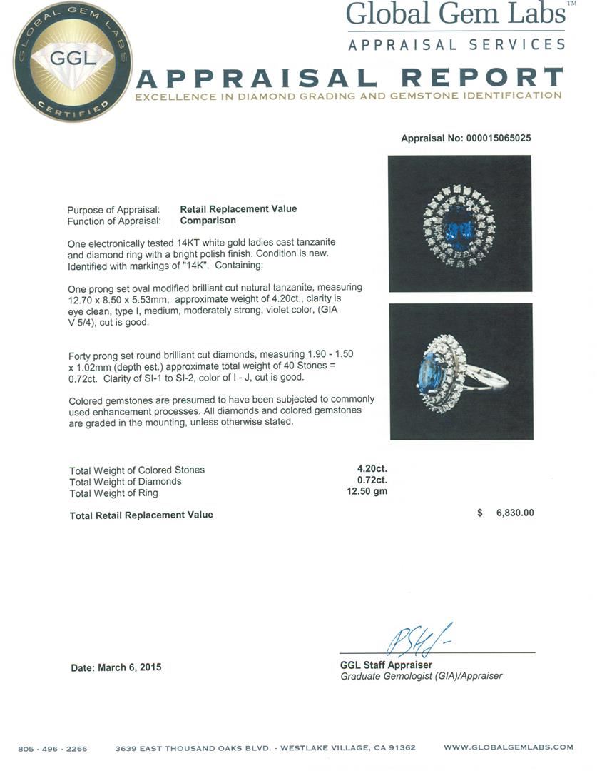 One electronically tested 14KT white gold ladies cast tanzanite and diamond ring with a bright polish finish. Identified with markings of "14K". Condition is new. Containing: One prong set oval modified brilliant cut natural tanzanite, measuring 12.70 x 8.50 x 5.53mm, approximate weight of 4.20ct., clarity is eye clean, type I, medium, moderately strong, violet color, (GIA V 5/4), cut is good. Forty prong set round brilliant cut diamonds, measuring 1.90 - 1.50 x 1.02mm (depth est.) approximate total weight of 40 Stones = 0.72ct. . Clarity: SI-1 to SI-2. Color: I - J, Cut is Good. Colored gemstones are presumed to have been subjected to commonly used enhancement processes. All diamonds and colored gemstones are graded in the mounting, unless otherwise stated.. Total Weight of Colored Stones 4.20ct.. Total Weight of Diamonds 0.72ct.. Total Weight of Ring 12.50 grams. GGL Appraised at $6,830.00.