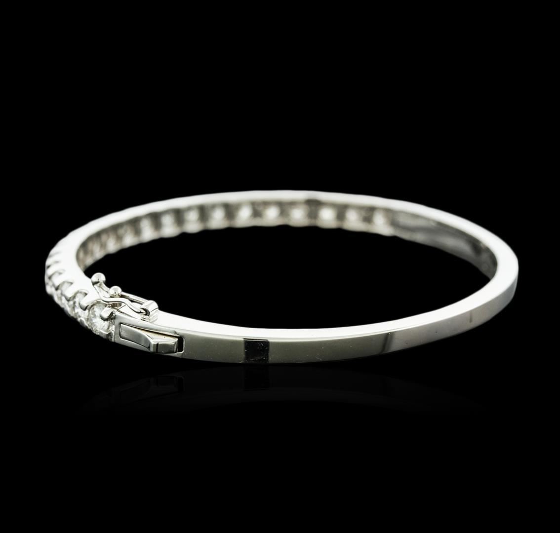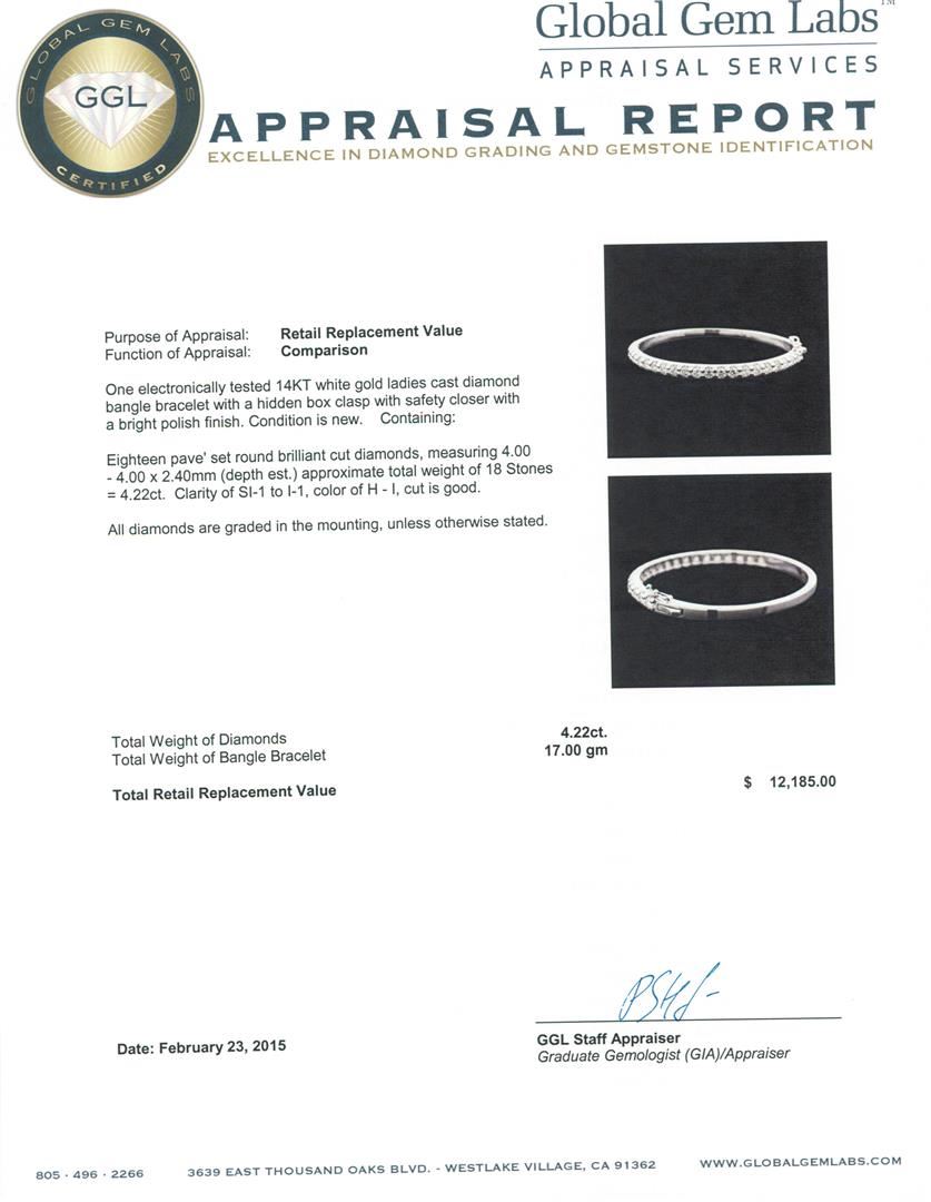 One electronically tested 14KT white gold ladies cast diamond bangle bracelet with a hidden box clasp with safety closer with a bright polish finish. Condition is new. Containing: Eighteen pave' set round brilliant cut diamonds, measuring 4.00 - 4.00 x 2.40mm (depth est.) approximate total weight of 18 Stones = 4.22ct. Clarity: SI-1 to I-1. Color: H - I, Cut is Good. All diamonds are graded in the mounting, unless otherwise stated. Total Weight of Diamonds 4.22ct. Total Weight of Bangle Bracelet 17.00 grams. GGL Appraised at $12,185.00.