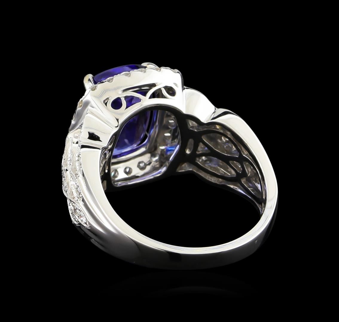 One electronically tested 14KT white gold ladies combination cast & assembled tanzanite and diamond ring with a flat shank with a bright polish finish. Identified with markings of "14K". Condition is new. Containing: One prong set rectangular cushion modified brilliant cut natural tanzanite, measuring 11.07 x 8.32 x 5.84mm, approximate weight of 4.23ct., clarity is eye clean, type I, medium, moderately strong, violet color, (GIA V 5/4), cut is good. Sixty-One prong set round brilliant cut diamonds, measuring 1.50 - 1.50 x 0.90mm (depth est.) approximate total weight of 61 Stones = 0.75ct. Clarity: SI-1 to I-1. Color: I - J, Cut is Good. Colored gemstones are presumed to have been subjected to commonly used enhancement processes. All diamonds and colored gemstones are graded in the mounting, unless otherwise stated. Total Weight of Colored Stones 4.23ct. Total Weight of Diamonds 0.75ct. Total Weight of Ring 7.80 grams. GGL Appraised at $10,200.00.
