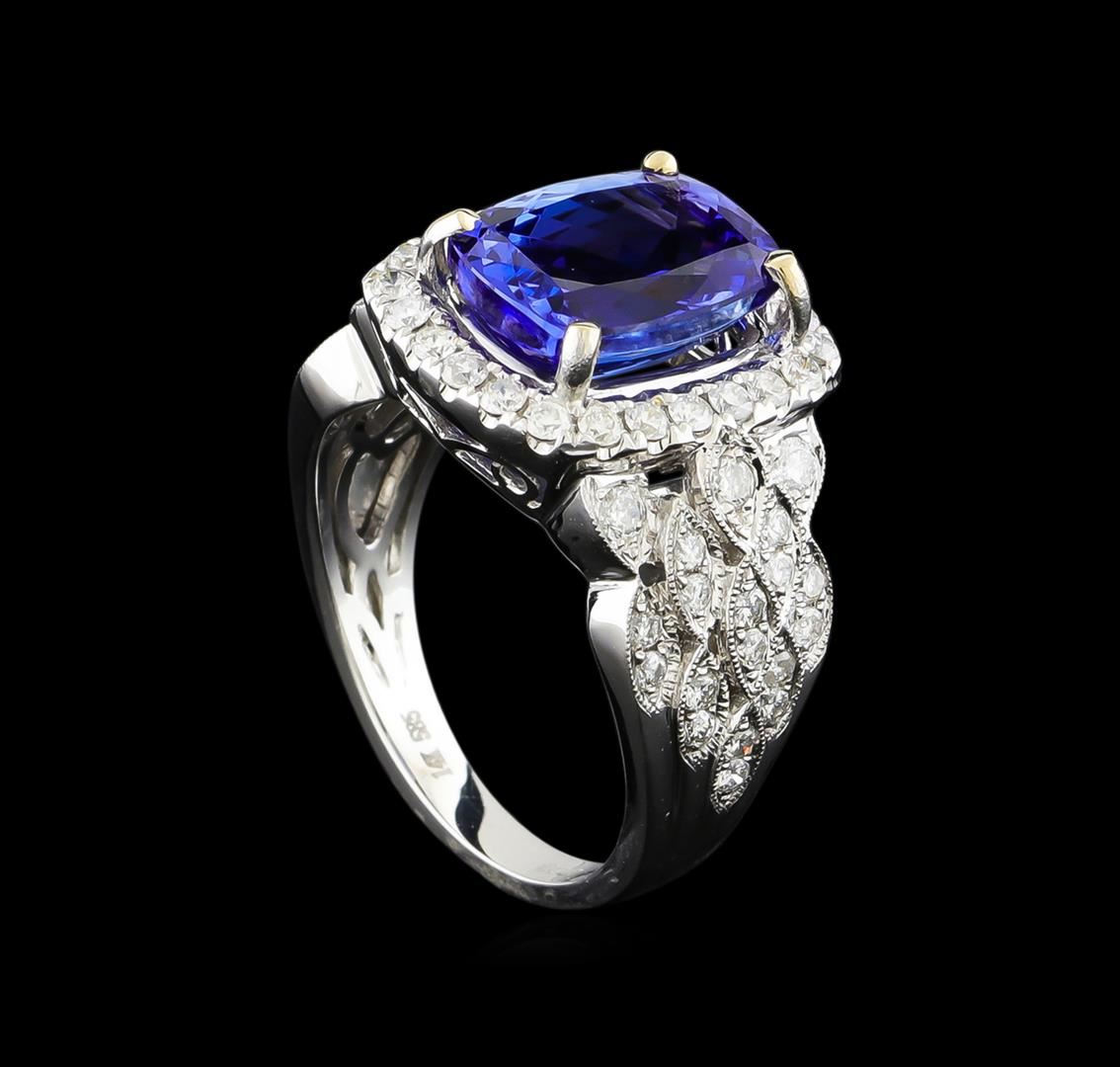 One electronically tested 14KT white gold ladies combination cast & assembled tanzanite and diamond ring with a flat shank with a bright polish finish. Identified with markings of "14K". Condition is new. Containing: One prong set rectangular cushion modified brilliant cut natural tanzanite, measuring 11.07 x 8.32 x 5.84mm, approximate weight of 4.23ct., clarity is eye clean, type I, medium, moderately strong, violet color, (GIA V 5/4), cut is good. Sixty-One prong set round brilliant cut diamonds, measuring 1.50 - 1.50 x 0.90mm (depth est.) approximate total weight of 61 Stones = 0.75ct. Clarity: SI-1 to I-1. Color: I - J, Cut is Good. Colored gemstones are presumed to have been subjected to commonly used enhancement processes. All diamonds and colored gemstones are graded in the mounting, unless otherwise stated. Total Weight of Colored Stones 4.23ct. Total Weight of Diamonds 0.75ct. Total Weight of Ring 7.80 grams. GGL Appraised.