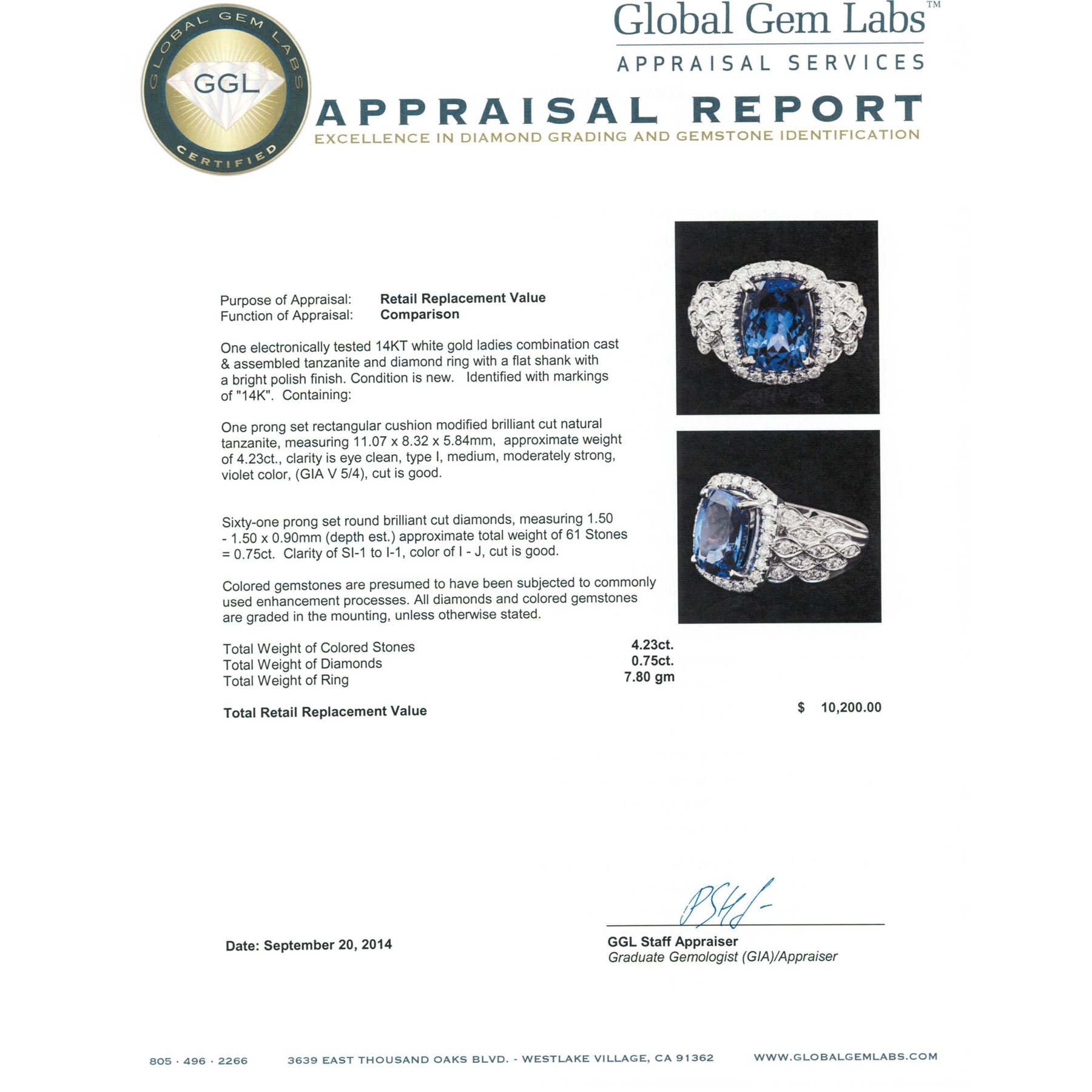 One electronically tested 14KT white gold ladies combination cast & assembled tanzanite and diamond ring with a flat shank with a bright polish finish. Identified with markings of "14K". Condition is new. Containing: One prong set rectangular cushion modified brilliant cut natural tanzanite, measuring 11.07 x 8.32 x 5.84mm, approximate weight of 4.23ct., clarity is eye clean, type I, medium, moderately strong, violet color, (GIA V 5/4), cut is good. Sixty-One prong set round brilliant cut diamonds, measuring 1.50 - 1.50 x 0.90mm (depth est.) approximate total weight of 61 Stones = 0.75ct. Clarity: SI-1 to I-1. Color: I - J, Cut is Good. Colored gemstones are presumed to have been subjected to commonly used enhancement processes. All diamonds and colored gemstones are graded in the mounting, unless otherwise stated. Total Weight of Colored Stones 4.23ct. Total Weight of Diamonds 0.75ct. Total Weight of Ring 7.80 grams. GGL Appraised.