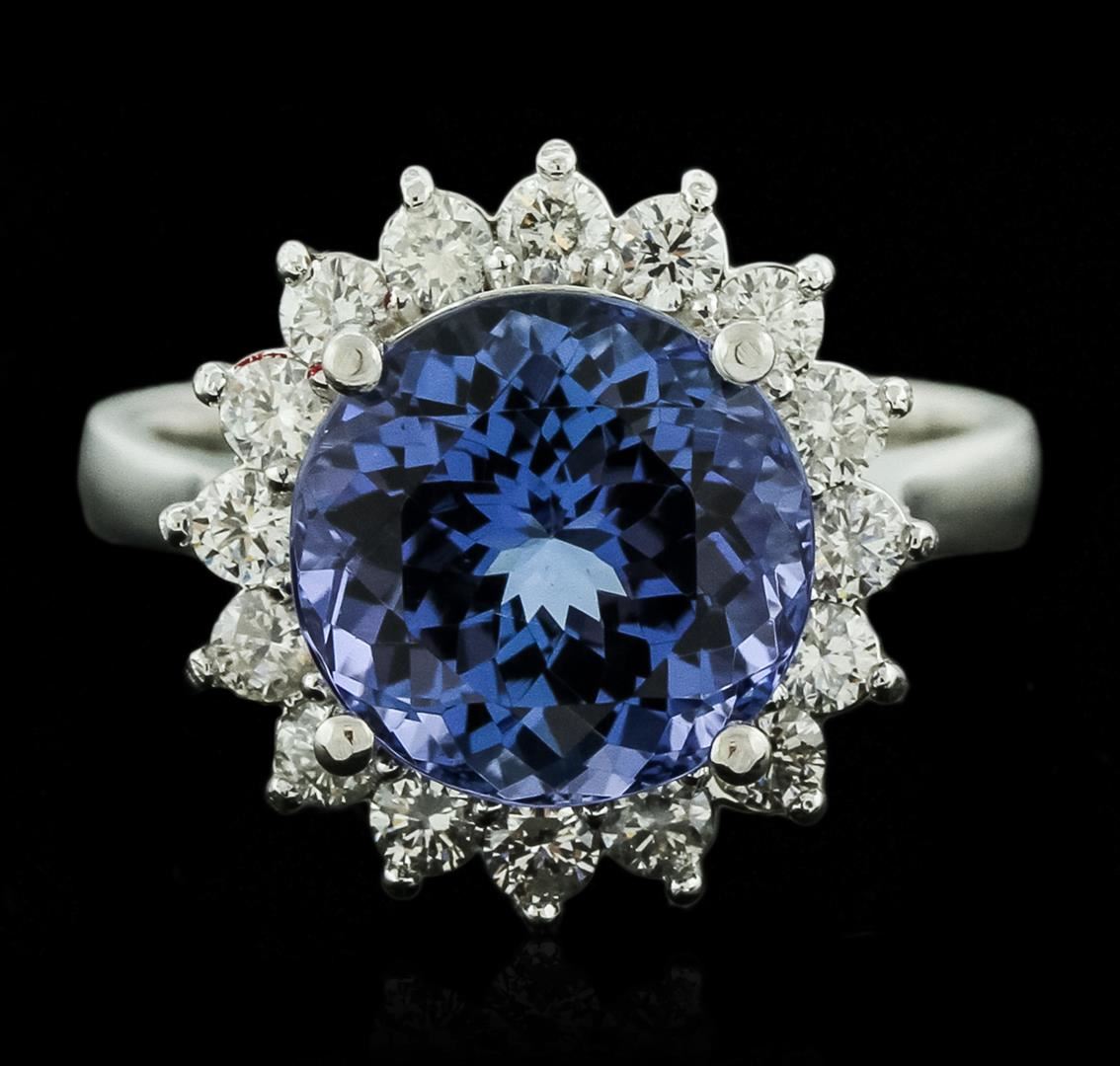One electronically tested 14KT white gold ladies cast tanzanite and diamond ring with a bright polish finish. Identified with markings of "K14". Condition is new. Containing: One prong set round modified brilliant cut natural tanzanite, measuring 9.90 - 9.90 x 6.44 mm, approximate weight of 4.23ct., clarity is eye clean, type I, medium light, very slightly grayish, violet color, (GIA V 4/3), cut is good. Sixteen prong set round brilliant cut diamonds, measuring 2.00 - 2.00 x 1.20mm (depth est.) approximate total weight of 16 Stones = 0.47ct. Clarity: SI-1 to SI-2. Color: H - I, Cut is Good. Colored gemstones are presumed to have been subjected to commonly used enhancement processes. All diamonds and colored gemstones are graded in the mounting, unless otherwise stated. Total Weight of Colored Stones 4.23ct. Total Weight of Diamonds 0.47ct. Total Weight of Ring 5.40 grams. GGL Appraised at $4,285.00.