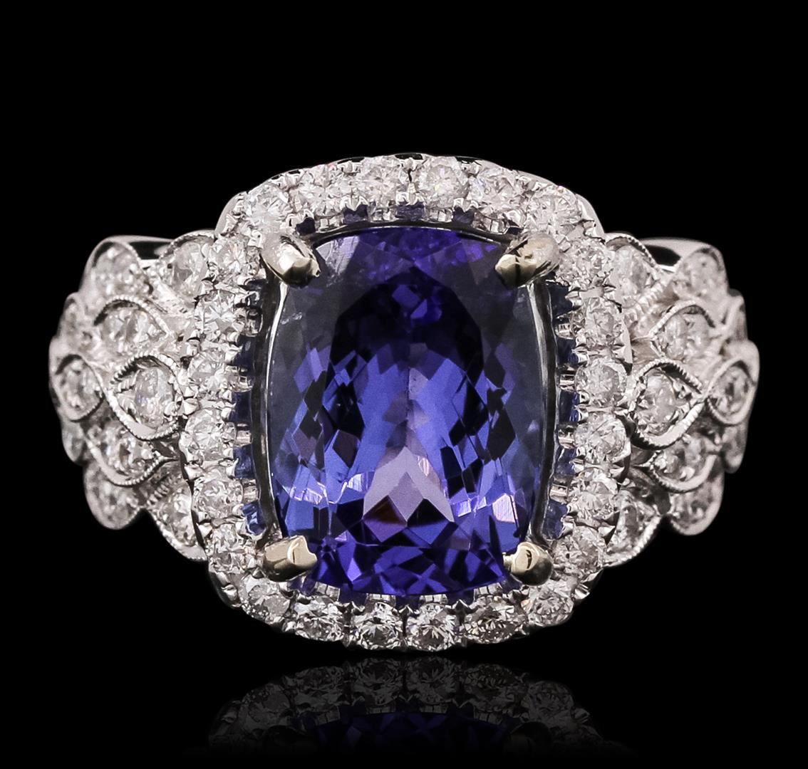 One electronically tested 14KT white gold ladies combination cast & assembled tanzanite and diamond ring with a flat shank with a bright polish finish. Identified with markings of "14K". Condition is new. Containing: One prong set rectangular cushion modified brilliant cut natural tanzanite, measuring 11.07 x 8.32 x 5.84mm, approximate weight of 4.23ct., clarity is eye clean, type I, medium, moderately strong, violet color, (GIA V 5/4), cut is good. Sixty-One prong set round brilliant cut diamonds, measuring 1.50 - 1.50 x 0.90mm (depth est.) approximate total weight of 61 Stones = 0.75ct. Clarity: SI-1 to I-1. Color: I - J, Cut is Good. Colored gemstones are presumed to have been subjected to commonly used enhancement processes. All diamonds and colored gemstones are graded in the mounting, unless otherwise stated. Total Weight of Colored Stones 4.23ct. Total Weight of Diamonds 0.75ct. Total Weight of Ring 7.80 grams. GGL Appraised at $10,200.00.
