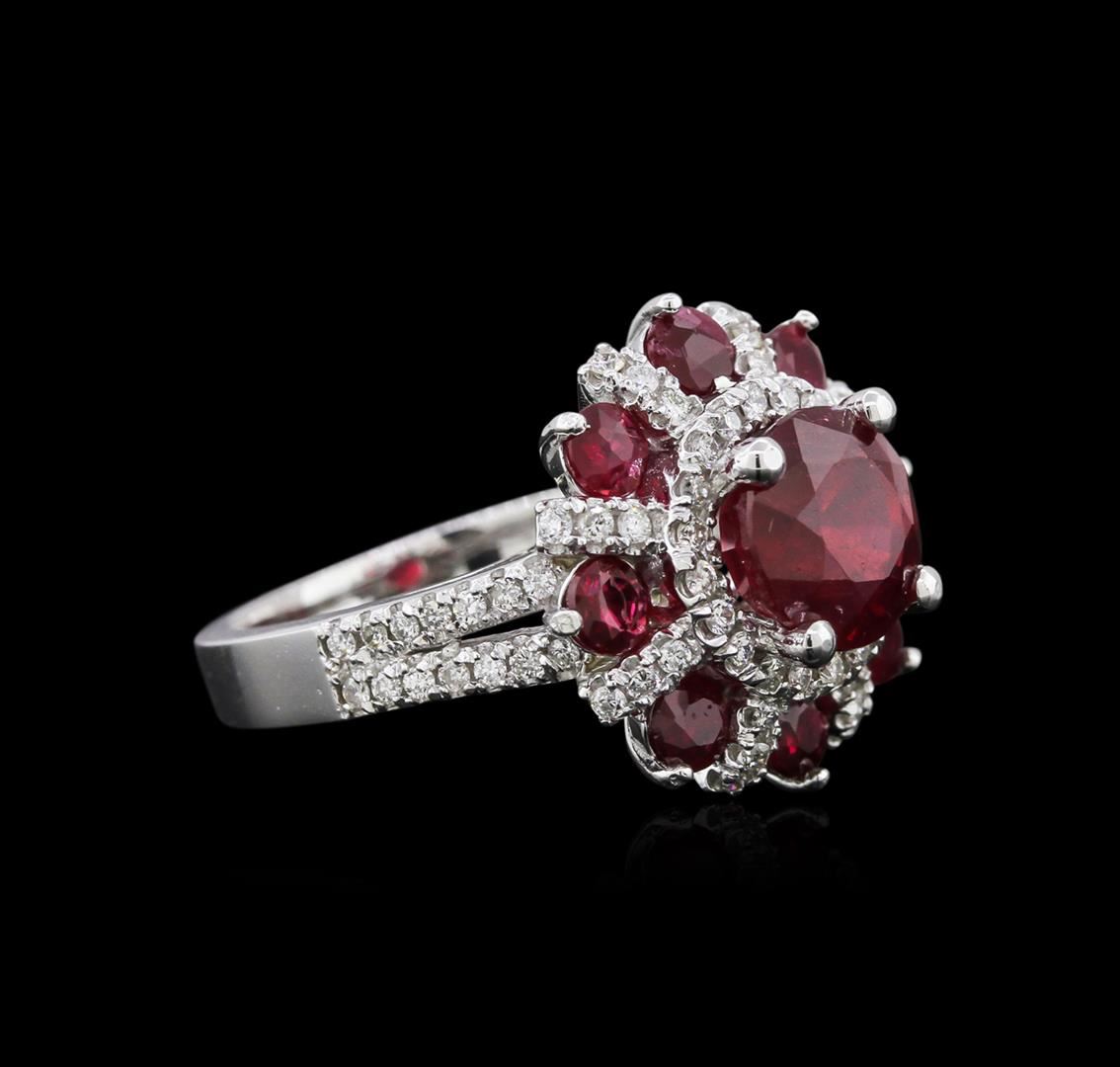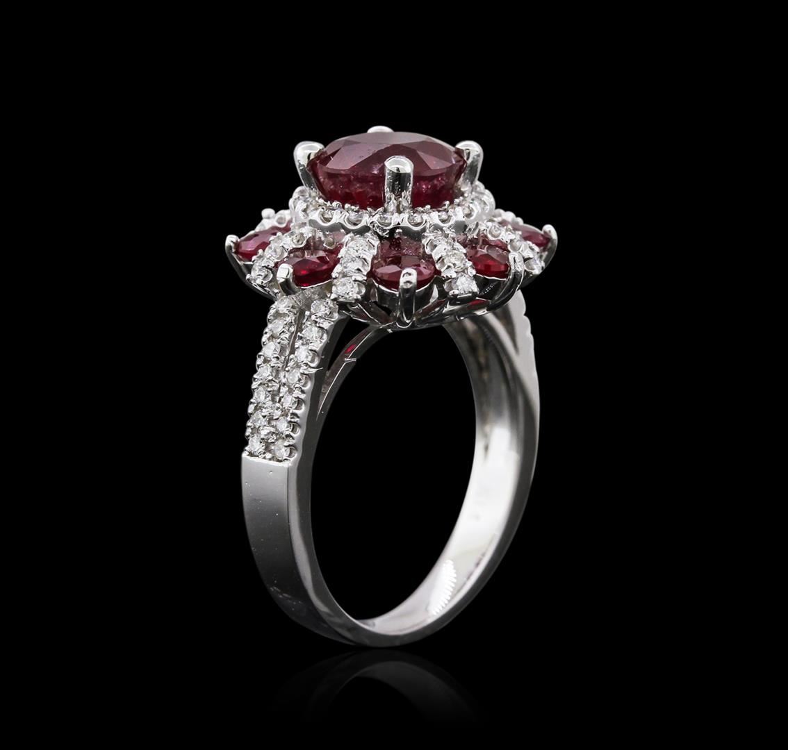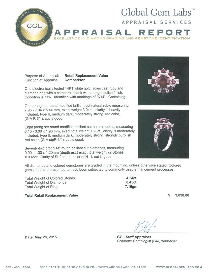 One electronically tested 14KT white gold ladies cast ruby and diamond ring with a cathedral shank with a bright polish finish. Identified with markings of "K14". Condition is new. Containing: One prong set round modified brilliant cut natural ruby, measuring 7.96 - 7.94 x 5.44 mm, exact weight 3.04ct., clarity is heavily included, type II, medium dark, moderately strong, red color, (GIA R 6/4), cut is good. Eight prong set round modified brilliant cut natural rubies, measuring 3.10 - 3.00 x 1.98 mm, exact total weight 1.20ct., clarity is moderately included, type II, medium dark, moderately strong, strongly purplish red color, (GIA stpR 6/4), cut is good. Seventy-Two prong set round brilliant cut diamonds, measuring 0.00 - 1.30 x 1.20mm (depth est.) exact total weight 72 Stones = 0.45ct. Clarity: SI-2 to I-1. Color: H - I, Cut is Good. All diamonds and colored gemstones are graded in the mounting, unless otherwise stated. Colored gemstones are presumed to have been subjected to commonly used enhancement processes. Total Weight of Colored Stones 4.24ct. Total Weight of Diamonds 0.45ct. Total Weight of Ring 7.16 grams. GGL Appraised at $3,030.00.