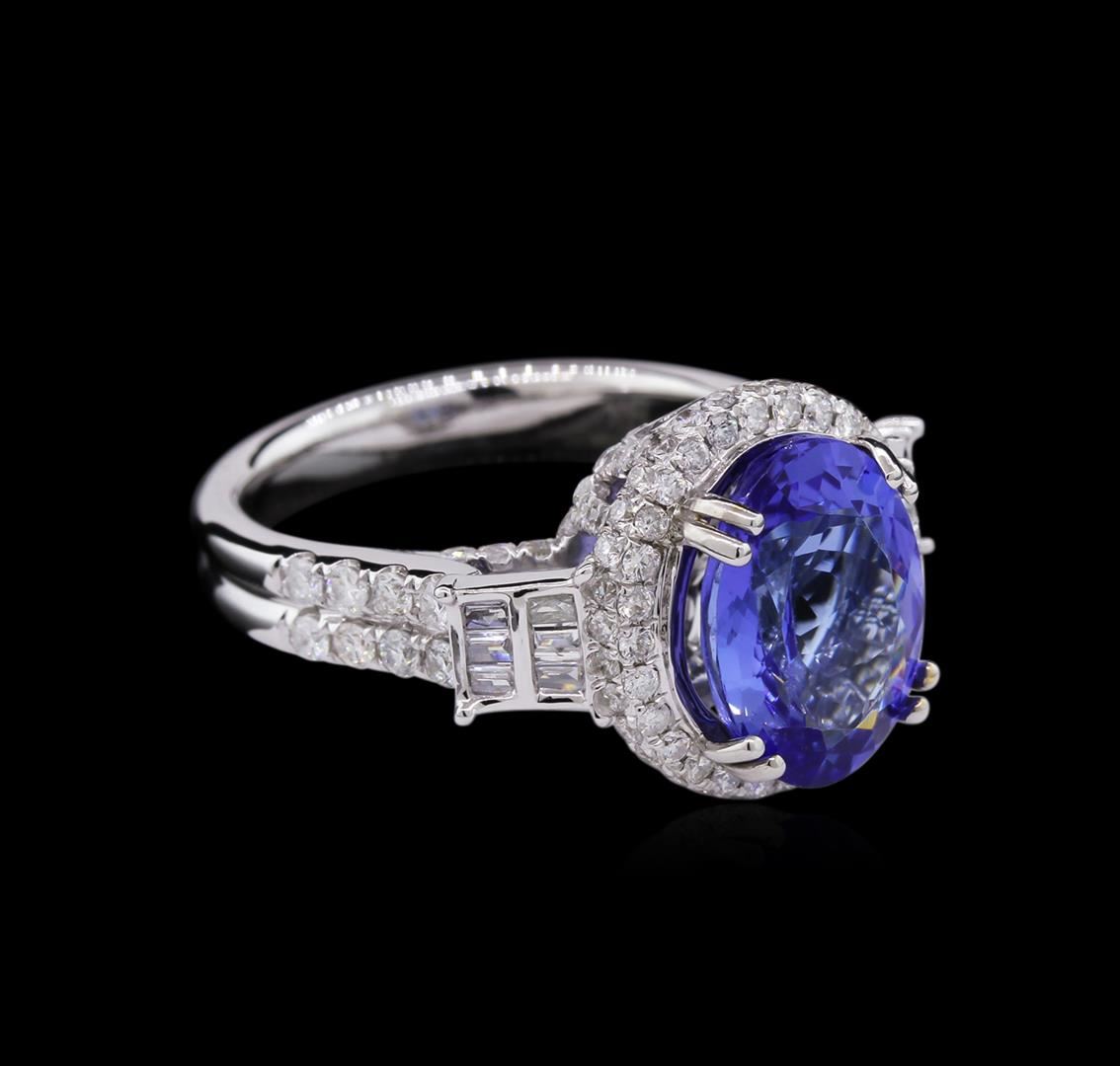 One electronically tested 14KT white gold Ladies combination cast & assembled ring with a bright polish finish. Condition is new. Identified with markings of "14K". Containing: One prong set oval modified brilliant cut natural tanzanite, measuring 11.80 x 9.00. x 5.85mm, approximate weight of 4.24ct., clarity is eye clean, type I, medium, moderately strong, bluish violet color, (GIA bV 5/4), cut is good. Colored gemstones are presumed to have been subjected to commonly used color/clarity enhancement processes. One Hundred Twenty-Six prong set round brilliant cut diamonds, measuring 1.60 - 1.30 x 0.87mm (depth est.) approximate. Total Weight of 126 Stones = 1.00ct. . Clarity: I-1 to I-2. Color: H, Cut is Good. Twelve channel set baguette cut diamonds, measuring 1.50 x 1.30 x 1.11mm (depth est.) approximate. Total Weight of 12 Stones = 0.24ct. . Clarity: I-1 to I-2. Color: I - J, Cut is Good. . Total Weight of Colored Stones 4.24ct. Total Weight of Diamonds 1.24ct. Total Weight of Ring 7.60 grams. GGL Appraised at $10,870.00.