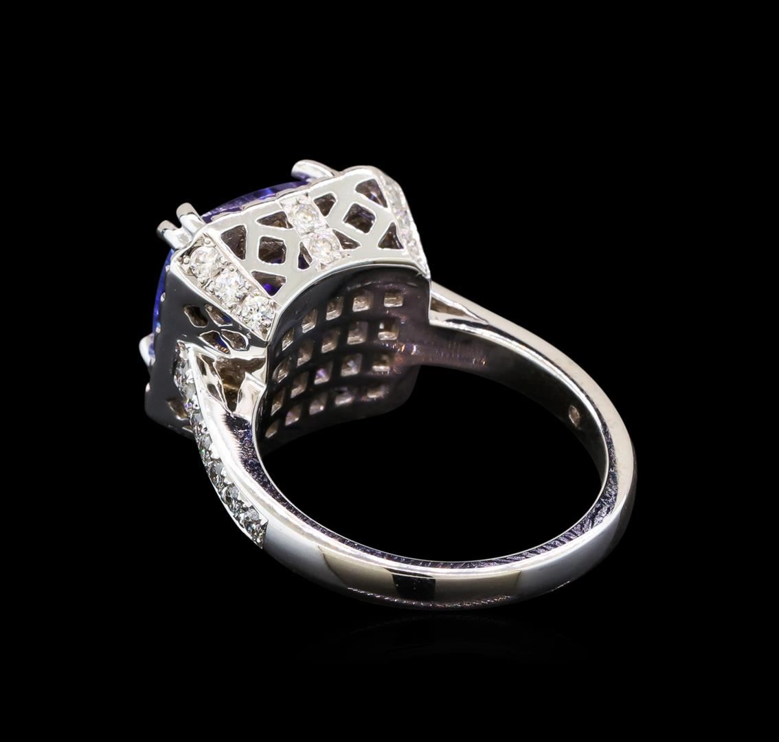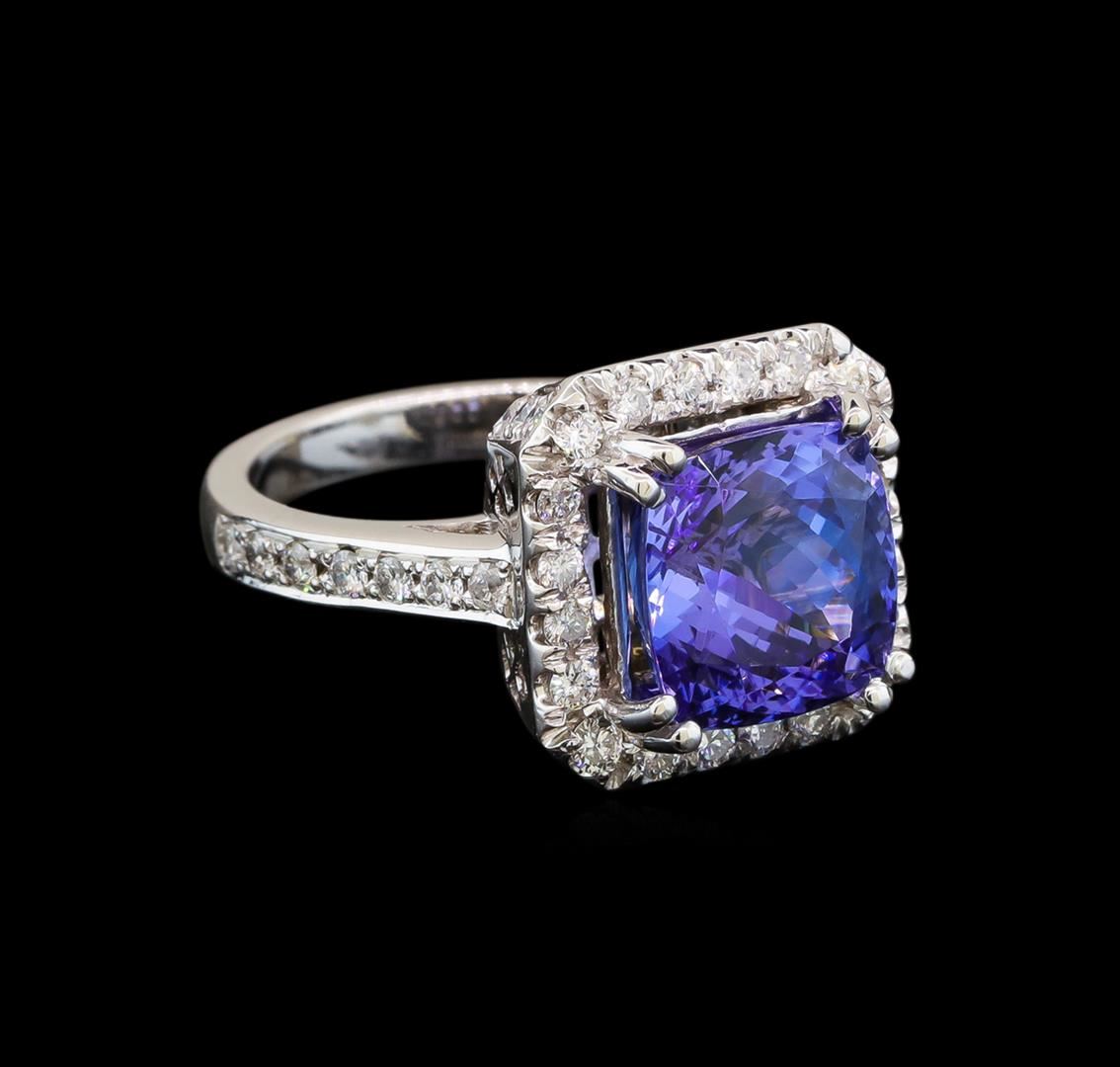 One electronically tested 14KT white gold ladies cast tanzanite and diamond ring with a bright polish finish. Identified with markings of "K14". Condition is new. Containing: One prong set square cushion modified brilliant cut natural tanzanite, measuring 9.40 x 9.40 x 6.11mm, approximate weight of 4.25ct., clarity is eye clean, type I, medium light, very slightly grayish, violet color, (GIA V 4/3), cut is good. Fifty prong set round brilliant cut diamonds, measuring 1.30 - 1.30 x 0.78mm (depth est.) approximate total weight of 50 Stones = 0.40ct. Clarity: SI-1 to I-1. Color: H - I, Cut is Good. Colored gemstones are presumed to have been subjected to commonly used enhancement processes. All diamonds and colored gemstones are graded in the mounting, unless otherwise stated. Total Weight of Colored Stones 4.25ct. Total Weight of Diamonds 0.40ct. Total Weight of Ring 7.40 grams. GGL Appraised at $5,170.00.