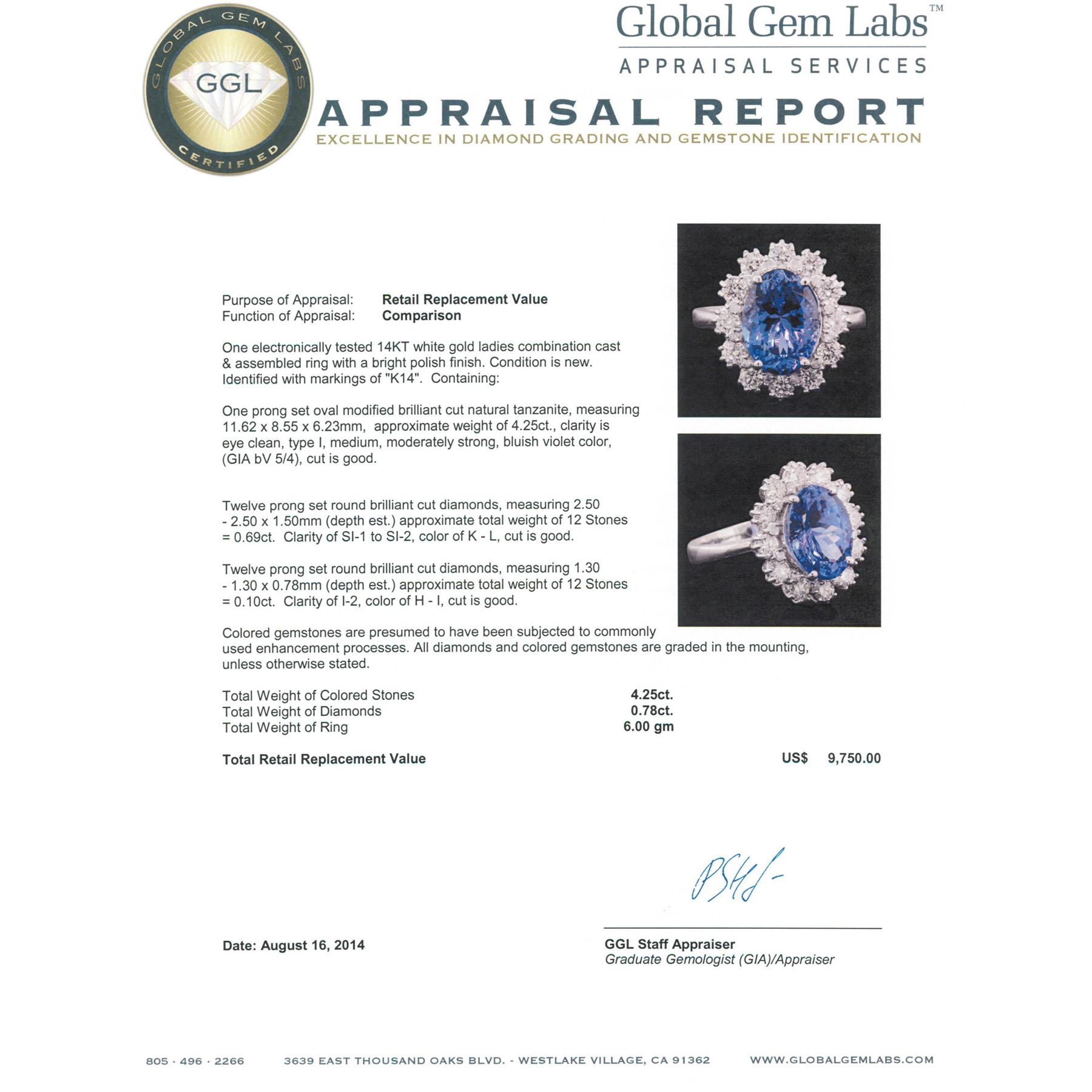 One electronically tested 14KT white gold ladies combination cast & assembled ring with a bright polish finish. Condition is new. Identified with markings of "K14". Containing: One prong set oval modified brilliant cut natural tanzanite, measuring 11.62 x 8.55 x 6.23mm, approximate weight of 4.25ct., clarity is eye clean, type I, medium, moderately strong, bluish violet color, (GIA bV 5/4), cut is good. Twelve prong set round brilliant cut diamonds, measuring 2.50 - 2.50 x 1.50mm (depth est.) approximate. Total Weight of 12 Stones = 0.69ct. Clarity: SI-1 to SI-2. Color: K - L, Cut is Good. Twelve prong set round brilliant cut diamonds, measuring 1.30 - 1.30 x 0.78mm (depth est.) approximate. Total Weight of 12 Stones = 0.10ct. Clarity: I-2. Color: H - I, Cut is Good. Colored gemstones are presumed to have been subjected to commonly used enhancement processes. All diamonds and colored gemstones are graded in the mounting, unless otherwise stated. Total Weight of Colored Stones 4.25ct. Total Weight of Diamonds 0.78ct. Total Weight of Ring 6.00 grams. GGL Appraised at $9,750.00.
