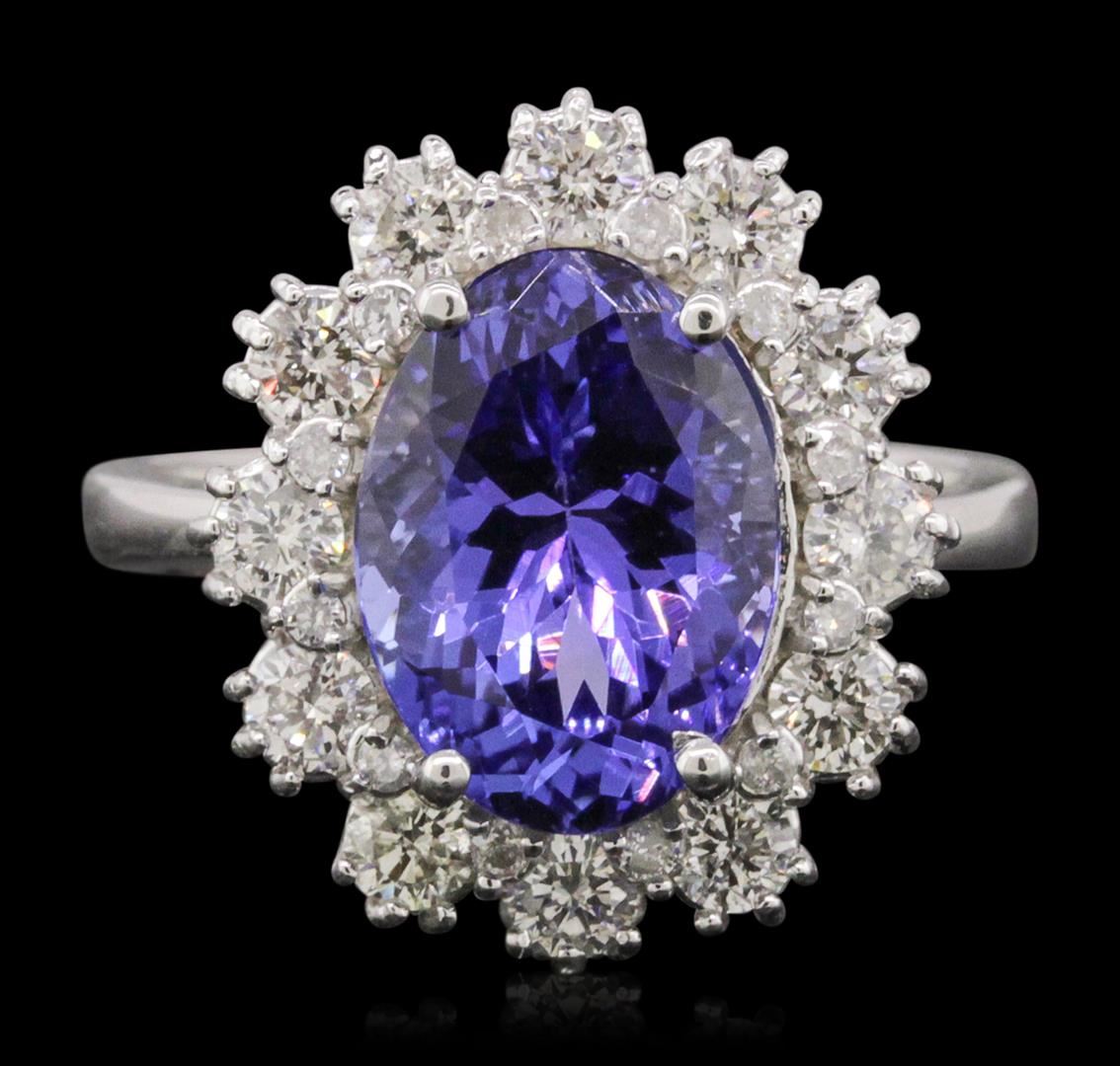 One electronically tested 14KT white gold ladies combination cast & assembled ring with a bright polish finish. Condition is new. Identified with markings of "K14". Containing: One prong set oval modified brilliant cut natural tanzanite, measuring 11.62 x 8.55 x 6.23mm, approximate weight of 4.25ct., clarity is eye clean, type I, medium, moderately strong, bluish violet color, (GIA bV 5/4), cut is good. Twelve prong set round brilliant cut diamonds, measuring 2.50 - 2.50 x 1.50mm (depth est.) approximate. Total Weight of 12 Stones = 0.69ct. Clarity: SI-1 to SI-2. Color: K - L, Cut is Good. Twelve prong set round brilliant cut diamonds, measuring 1.30 - 1.30 x 0.78mm (depth est.) approximate. Total Weight of 12 Stones = 0.10ct. Clarity: I-2. Color: H - I, Cut is Good. Colored gemstones are presumed to have been subjected to commonly used enhancement processes. All diamonds and colored gemstones are graded in the mounting, unless otherwise stated. Total Weight of Colored Stones 4.25ct. Total Weight of Diamonds 0.78ct. Total Weight of Ring 6.00 grams. GGL Appraised at $9,750.00.