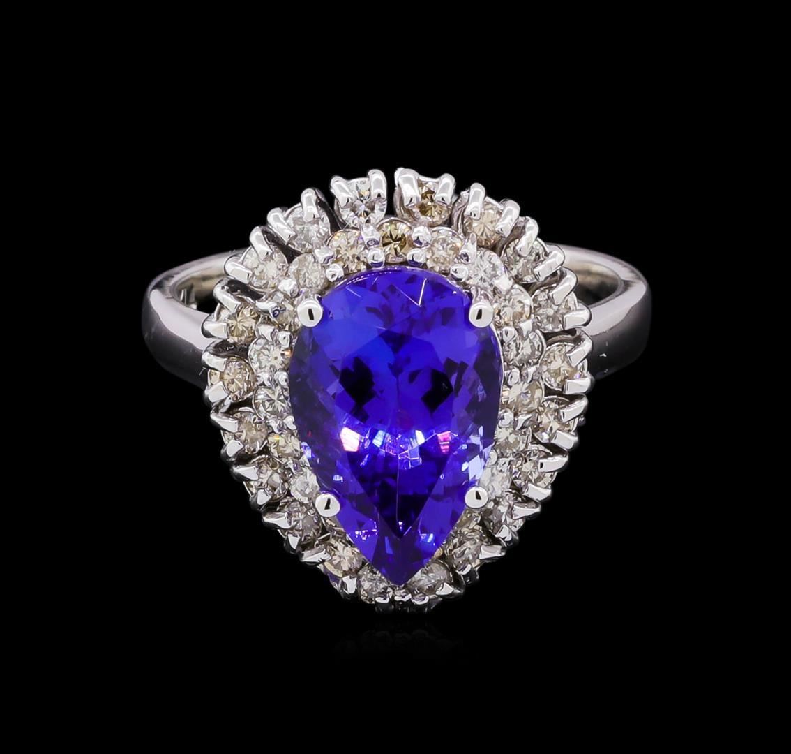One electronically tested 14KT white gold ladies cast tanzanite and diamond ring with a bright polish finish. Condition is new, good workmanship. The featured tanzanite is set within a two tiered diamond lattice gallery, completed by a two and one-half millimeter wide band. Identified with markings of "K14". Containing: One prong set pear mixed cut natural tanzanite, measuring 12.25 x 8.00 x 6.00mm, 8%. bulge factor, approximate weight of 4.25ct., clarity is eye clean, type I, medium dark, very slightly grayish, bluish violet color, (GIA bV 6/3), cut is good. Transmitting light with no distortion, transparent. Graded in the setting. Tanzanite is a very rare gemstone that is only found in the country of Tanzania. Originally discovered in 1967. Tiffany & Company, named the stone Tanzanite. It is found in the Usumburu Mountains that border the Umba Valley of northern Tanzania. Tanzanite occurs in gray, brown, violet, blue, reddish-purple, & green. The gem is interesting because of its exceptional pleochroism. Rotated in different directions a tanzanite will exhibit multiple changes of color. Tanzanite has a low tolerance to ultrasonic cleaning, and should not be cleaned using this method. Thirty-Nine prong set round brilliant cut diamonds, measuring 1.70 - 1.60 x 0.99mm (depth est.) approximate. Total Weight of 39 Stones = 0.73ct. Faint secondary color throughout. Graded in the setting. Clarity: SI-2 to I-1. Color: J - L. Total Weight of Colored Stones 4.25ct. Total Weight of Diamonds 0.73ct. Total Weight of Ring 6.50 grams. AIG Appraised.