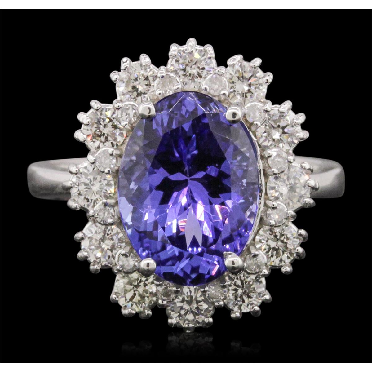 One electronically tested 14KT white gold ladies combination cast & assembled ring with a bright polish finish. Condition is new. Identified with markings of "K14". Containing: One prong set oval modified brilliant cut natural tanzanite, measuring 11.62 x 8.55 x 6.23mm, approximate weight of 4.25ct., clarity is eye clean, type I, medium, moderately strong, bluish violet color, (GIA bV 5/4), cut is good. Twelve prong set round brilliant cut diamonds, measuring 2.50 - 2.50 x 1.50mm (depth est.) approximate. Total Weight of 12 Stones = 0.69ct. Clarity: SI-1 to SI-2. Color: K - L, Cut is Good. Twelve prong set round brilliant cut diamonds, measuring 1.30 - 1.30 x 0.78mm (depth est.) approximate. Total Weight of 12 Stones = 0.10ct. Clarity: I-2. Color: H - I, Cut is Good. Colored gemstones are presumed to have been subjected to commonly used enhancement processes. All diamonds and colored gemstones are graded in the mounting, unless otherwise stated. Total Weight of Colored Stones 4.25ct. Total Weight of Diamonds 0.78ct. Total Weight of Ring 6.00 grams. GGL Appraised at $9,750.00.