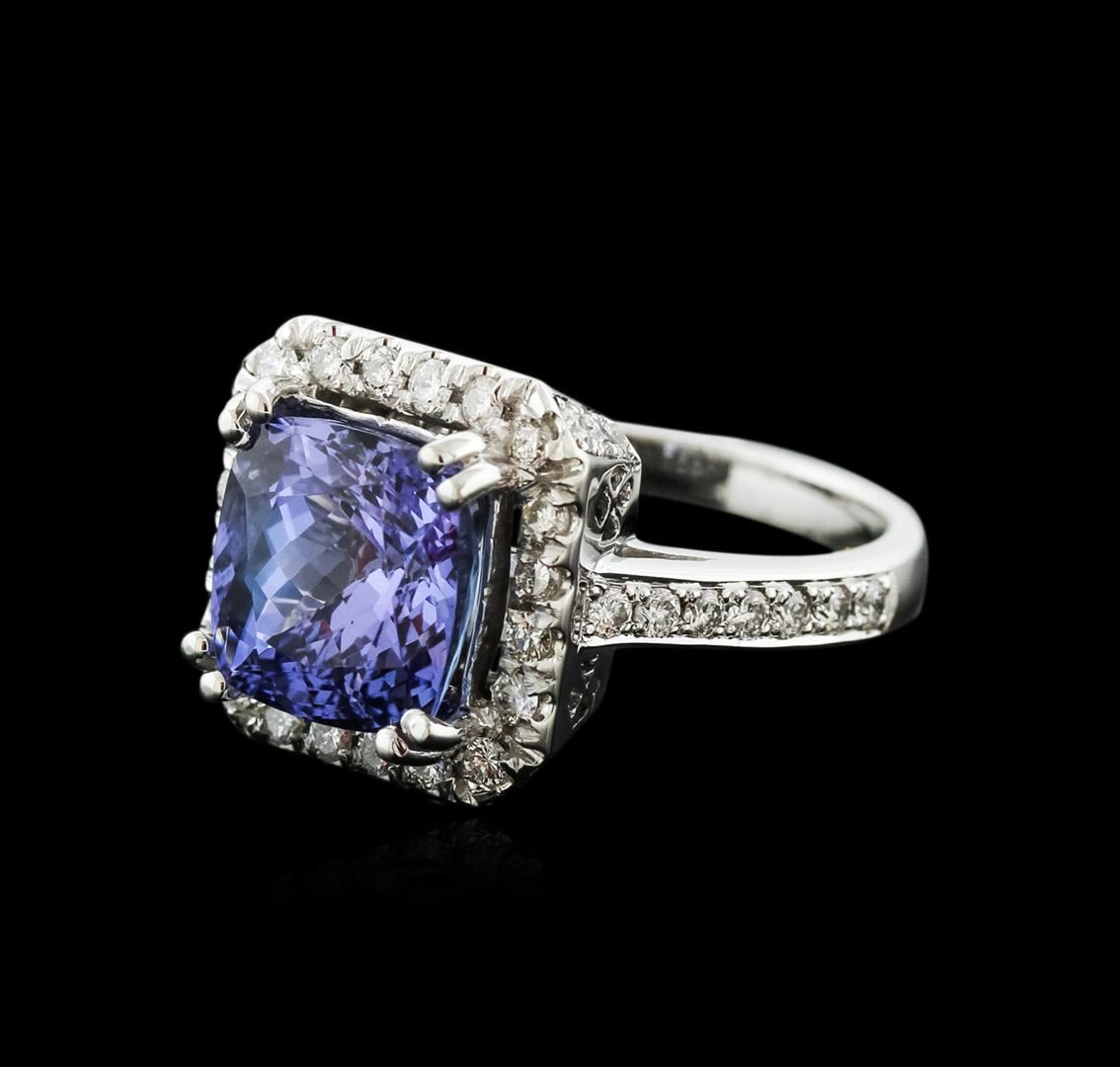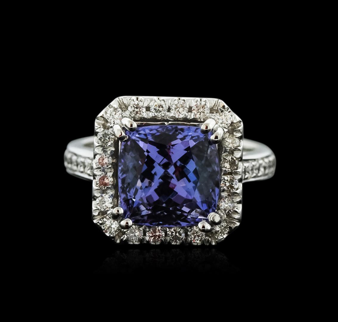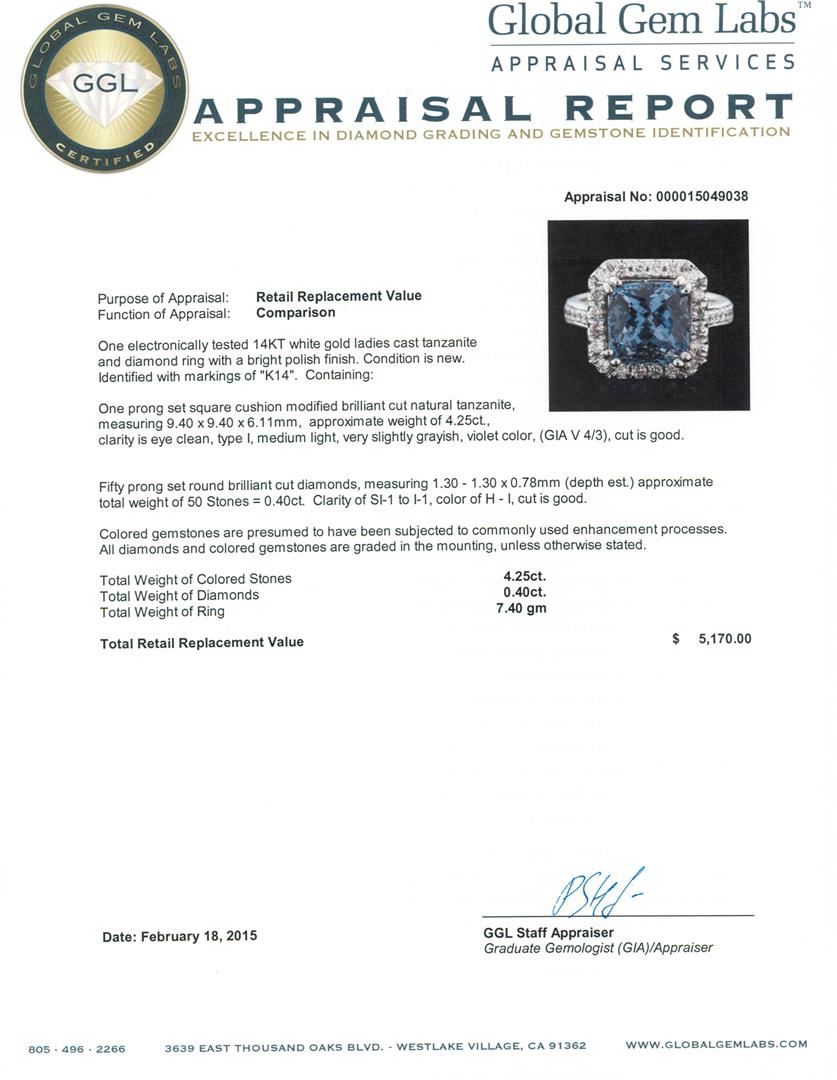 One electronically tested 14KT white gold ladies cast tanzanite and diamond ring with a bright polish finish. Identified with markings of "K14". Condition is new. Containing: One prong set square cushion modified brilliant cut natural tanzanite, measuring 9.40 x 9.40 x 6.11mm, approximate weight of 4.25ct., clarity is eye clean, type I, medium light, very slightly grayish, violet color, (GIA V 4/3), cut is good. Fifty prong set round brilliant cut diamonds, measuring 1.30 - 1.30 x 0.78mm (depth est.) approximate total weight of 50 Stones = 0.40ct. Clarity: SI-1 to I-1. Color: H - I, Cut is Good. Colored gemstones are presumed to have been subjected to commonly used enhancement processes. All diamonds and colored gemstones are graded in the mounting, unless otherwise stated. Total Weight of Colored Stones 4.25ct. Total Weight of Diamonds 0.40ct. Total Weight of Ring 7.40 grams. GGL Appraised at $5,170.00.