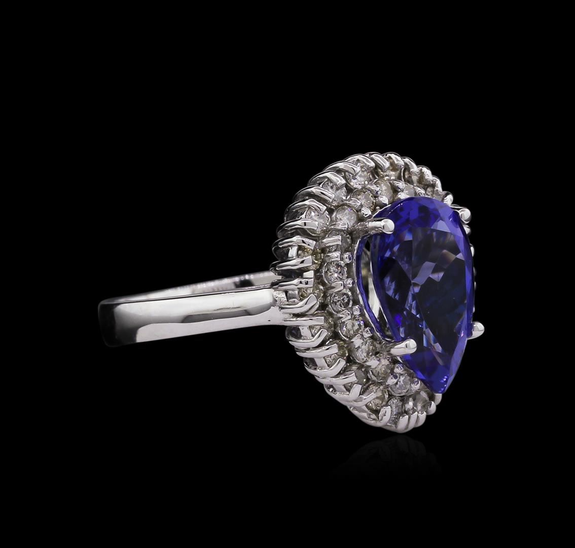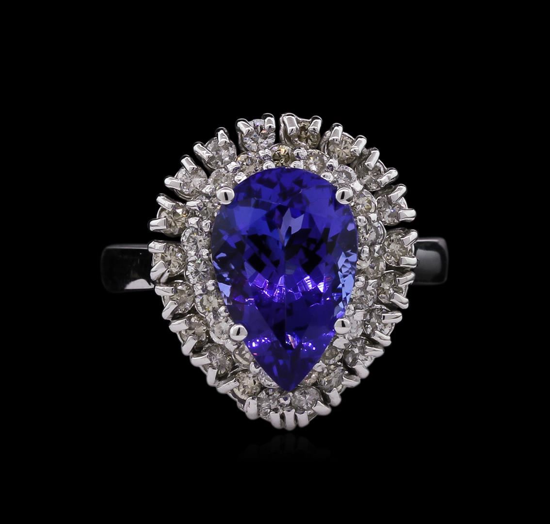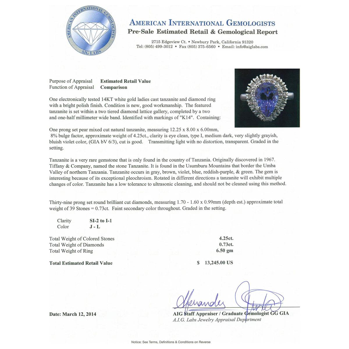 One electronically tested 14KT white gold ladies cast tanzanite and diamond ring with a bright polish finish. Condition is new, good workmanship. The featured tanzanite is set within a two tiered diamond lattice gallery, completed by a two and one-half millimeter wide band. Identified with markings of "K14". Containing: One prong set pear mixed cut natural tanzanite, measuring 12.25 x 8.00 x 6.00mm, 8%. bulge factor, approximate weight of 4.25ct., clarity is eye clean, type I, medium dark, very slightly grayish, bluish violet color, (GIA bV 6/3), cut is good. Transmitting light with no distortion, transparent. Graded in the setting. Tanzanite is a very rare gemstone that is only found in the country of Tanzania. Originally discovered in 1967. Tiffany & Company, named the stone Tanzanite. It is found in the Usumburu Mountains that border the Umba Valley of northern Tanzania. Tanzanite occurs in gray, brown, violet, blue, reddish-purple, & green. The gem is interesting because of its exceptional pleochroism. Rotated in different directions a tanzanite will exhibit multiple changes of color. Tanzanite has a low tolerance to ultrasonic cleaning, and should not be cleaned using this method. Thirty-Nine prong set round brilliant cut diamonds, measuring 1.70 - 1.60 x 0.99mm (depth est.) approximate. Total Weight of 39 Stones = 0.73ct. Faint secondary color throughout. Graded in the setting. Clarity: SI-2 to I-1. Color: J - L. Total Weight of Colored Stones 4.25ct. Total Weight of Diamonds 0.73ct. Total Weight of Ring 6.50 grams. AIG Appraised at $13,245.00.