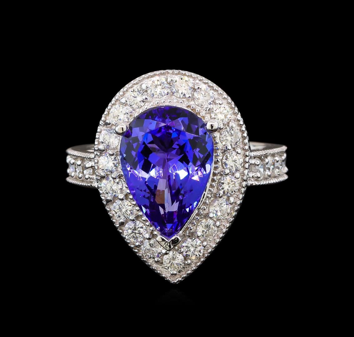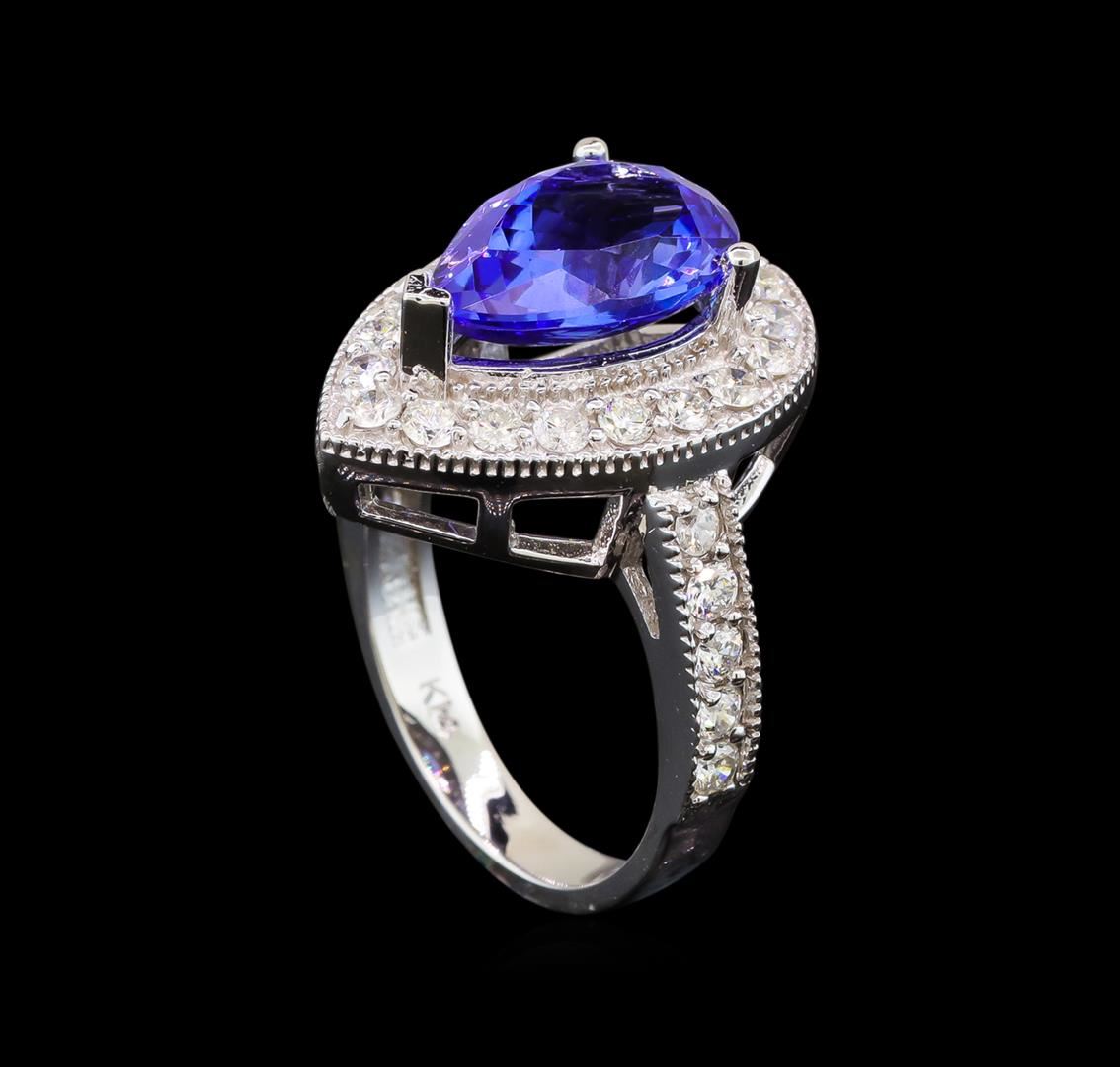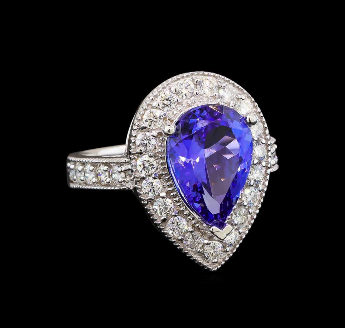 One electronically tested 14KT white gold ladies cast tanzanite and diamond ring with a bright polish finish. Identified with markings of "K14". Condition is new. Containing: One prong set pear modified brilliant cut natural tanzanite, measuring 13.00 x 8.90 x 5.50mm, approximate weight of 4.26ct., clarity is eye clean, type I, medium light, very slightly grayish, violet color, (GIA V 4/3), cut is good. Twenty-Nine prong set round brilliant cut diamonds, measuring 2.00 - 2.00 x 1.20mm (depth est.) approximate total weight of 29 Stones = 0.85ct. Clarity: SI-1 to SI-2. Color: H - I, Cut is Good. Colored gemstones are presumed to have been subjected to commonly used enhancement processes. All diamonds and colored gemstones are graded in the mounting, unless otherwise stated. Total Weight of Colored Stones 4.26ct. Total Weight of Diamonds 0.85ct. Total Weight of Ring 7.30 grams. GGL Appraised at $5,995.00.