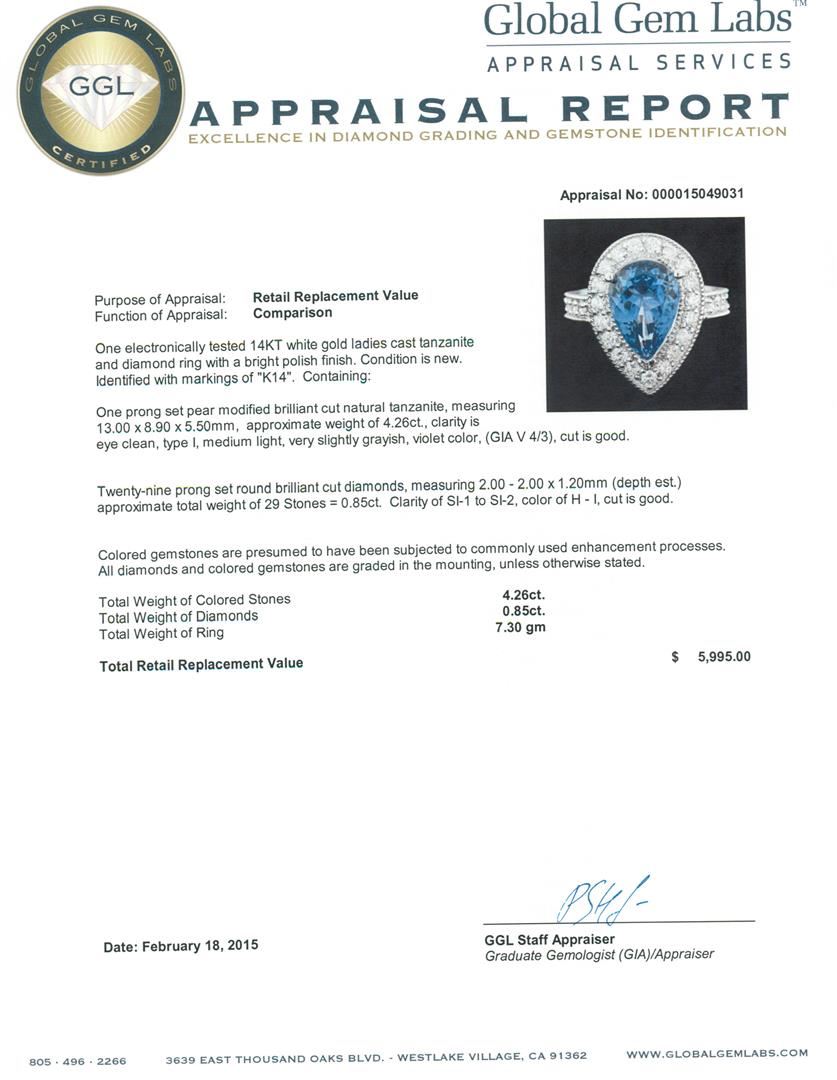 One electronically tested 14KT white gold ladies cast tanzanite and diamond ring with a bright polish finish. Identified with markings of "K14". Condition is new. Containing: One prong set pear modified brilliant cut natural tanzanite, measuring 13.00 x 8.90 x 5.50mm, approximate weight of 4.26ct., clarity is eye clean, type I, medium light, very slightly grayish, violet color, (GIA V 4/3), cut is good. Twenty-Nine prong set round brilliant cut diamonds, measuring 2.00 - 2.00 x 1.20mm (depth est.) approximate total weight of 29 Stones = 0.85ct. Clarity: SI-1 to SI-2. Color: H - I, Cut is Good. Colored gemstones are presumed to have been subjected to commonly used enhancement processes. All diamonds and colored gemstones are graded in the mounting, unless otherwise stated. Total Weight of Colored Stones 4.26ct. Total Weight of Diamonds 0.85ct. Total Weight of Ring 7.30 grams. GGL Appraised at $5,995.00.