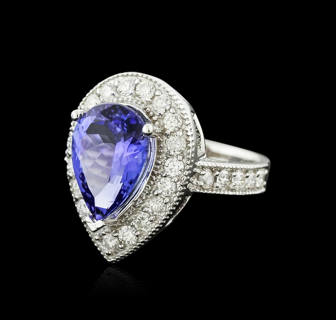 One electronically tested 14KT white gold ladies cast tanzanite and diamond ring with a bright polish finish. Identified with markings of "K14". Condition is new. Containing: One prong set pear modified brilliant cut natural tanzanite, measuring 13.00 x 8.90 x 5.50mm, approximate weight of 4.26ct., clarity is eye clean, type I, medium light, very slightly grayish, violet color, (GIA V 4/3), cut is good. Twenty-Nine prong set round brilliant cut diamonds, measuring 2.00 - 2.00 x 1.20mm (depth est.) approximate total weight of 29 Stones = 0.85ct. Clarity: SI-1 to SI-2. Color: H - I, Cut is Good. Colored gemstones are presumed to have been subjected to commonly used enhancement processes. All diamonds and colored gemstones are graded in the mounting, unless otherwise stated. Total Weight of Colored Stones 4.26ct. Total Weight of Diamonds 0.85ct. Total Weight of Ring 7.30 grams. GGL Appraised at $5,995.00.