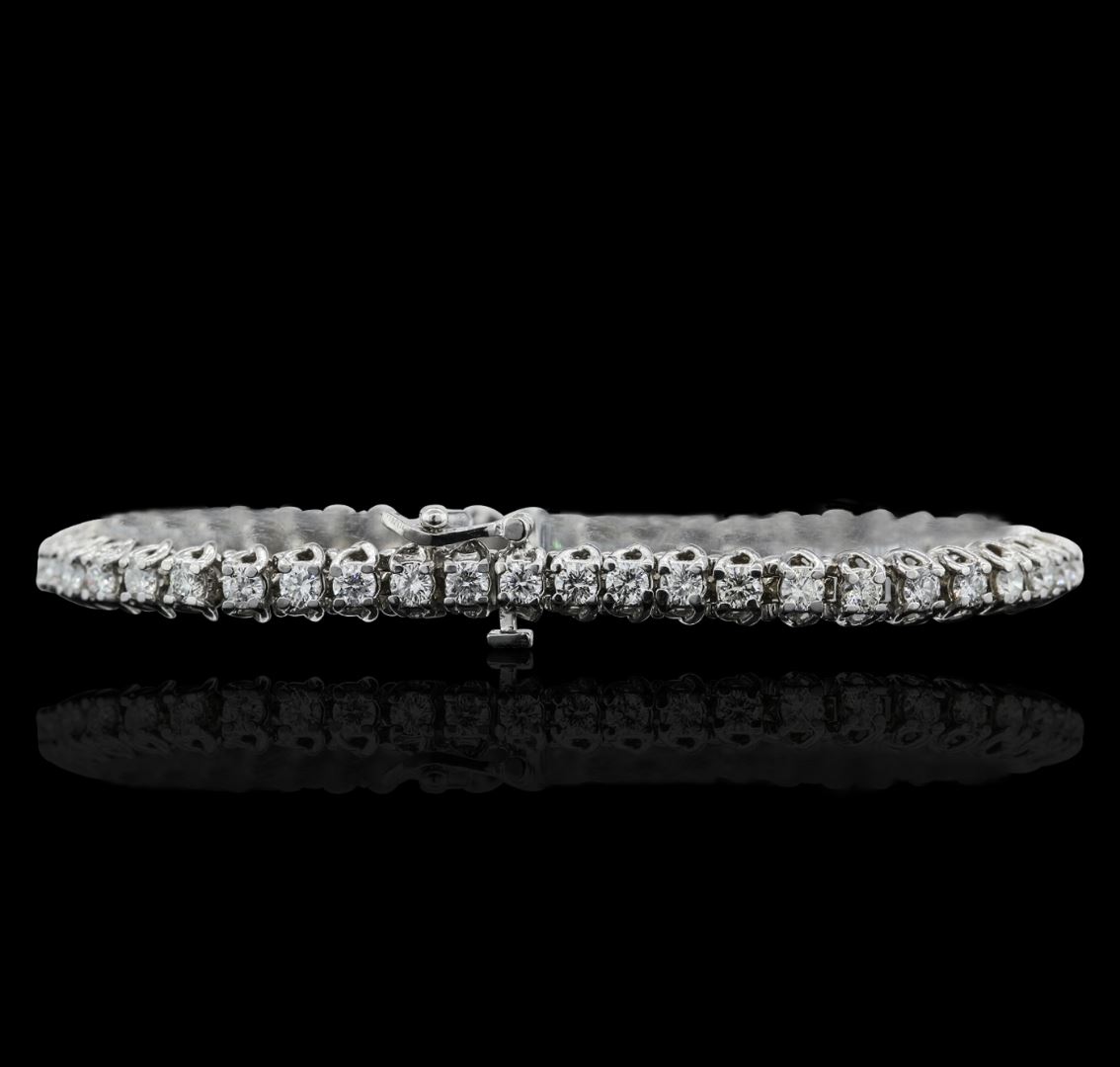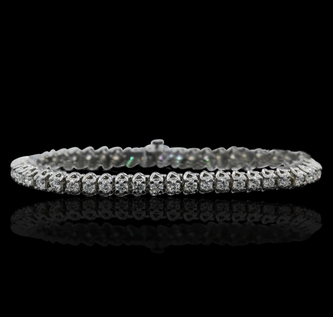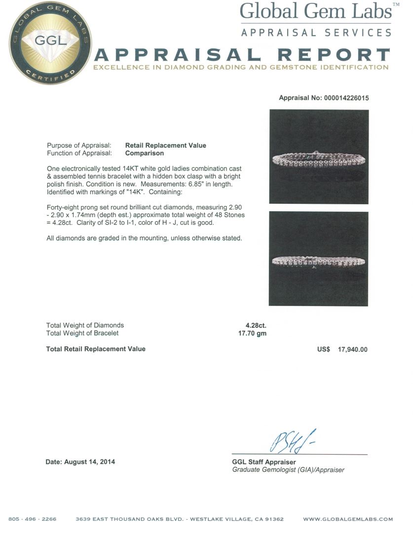 One electronically tested 14KT white gold ladies combination cast & assembled tennis bracelet with a hidden box clasp with a bright polish finish. Condition is new. Measurements: 6.85" in length. Identified with markings of "14K". Containing: Forty-Eight prong set round brilliant cut diamonds, measuring 2.90 - 2.90 x 1.74mm (depth est.) approximate total weight of 48 Stones = 4.28ct. Clarity: SI-2 to I-1. Color: H - J, Cut is Good. All diamonds are graded in the mounting, unless otherwise stated. Total Weight of Diamonds 4.28ct. Total Weight of Bracelet 17.70 grams. GGL Appraised at $17,940.00.