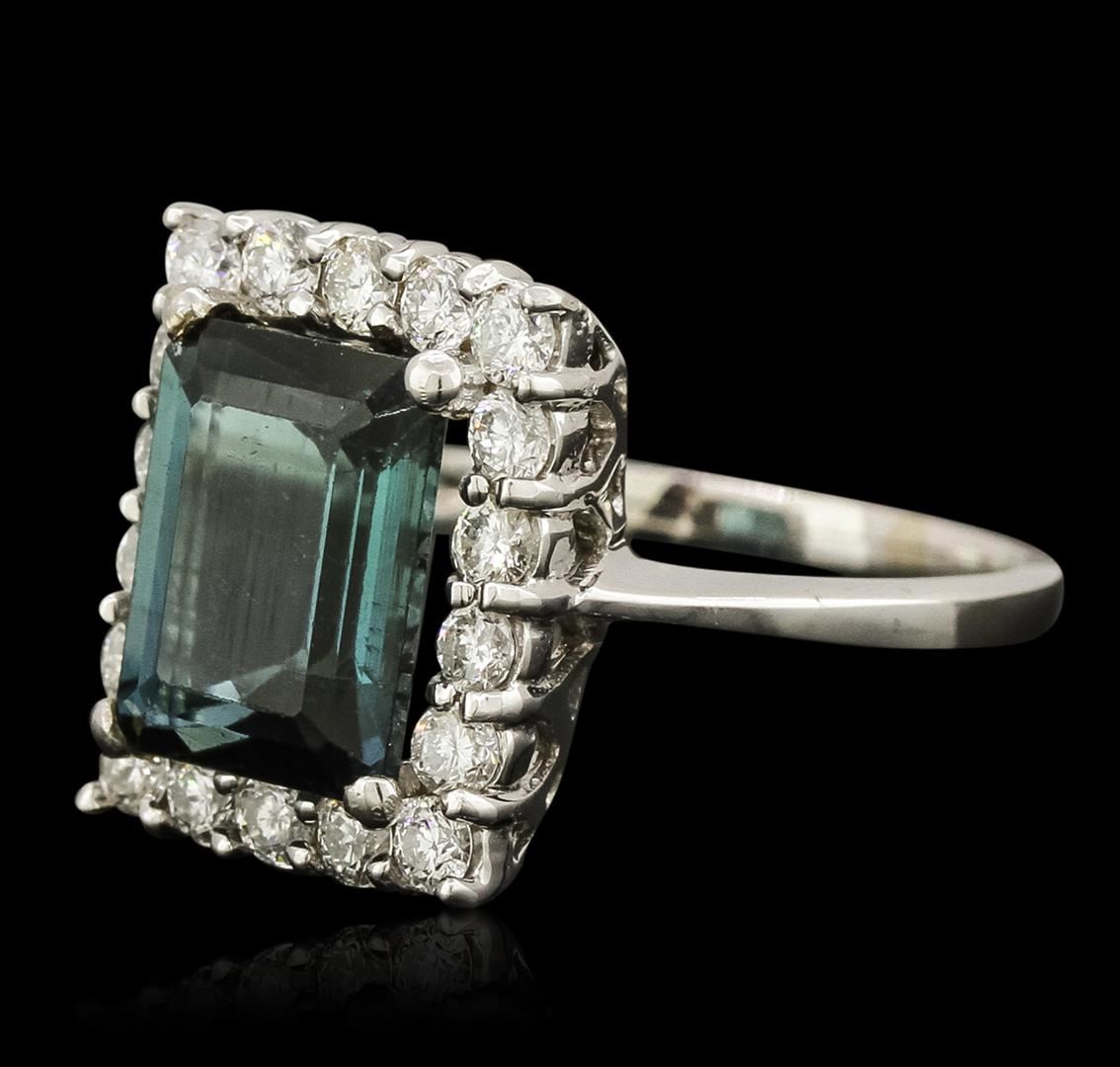 One electronically tested 14KT white gold ladies cast indicolite tourmaline and diamond ring with a bright polish finish. The featured indicolite tourmaline is set within a diamond bezel, completed by a one and one-half inch millimeter wide one and one-half millimeter wide band. Identified with markings of "14K". Condition is new, good workmanship. Containing: One prong set rectangular step cut natural indicolite, measuring 10.50 x 8.10 x 5.10mm, 8%. bulge factor, approximate weight of 4.30ct., clarity is slightly included, type II, medium dark, very slightly grayish, greenish blue color, (GIA gB 6/3), cut is good. Transmitting light with a minimum of distortion, transparent. Naturally occurring internal & external characteristics are present. Graded in the setting. Eighteen prong set round brilliant cut diamonds, measuring 2.30 - 2.20 x 1.35mm (depth est.) approximate. Total Weight of 18 Stones = 0.85ct. Graded in the setting. Clarity: SI-1 to I-1. Color: G - I. Total Weight of Colored Stones 4.30ct. Total Weight of Diamonds 0.85ct. Total Weight of Ring 4.98gm. AIG Appraised at $5,785.00.