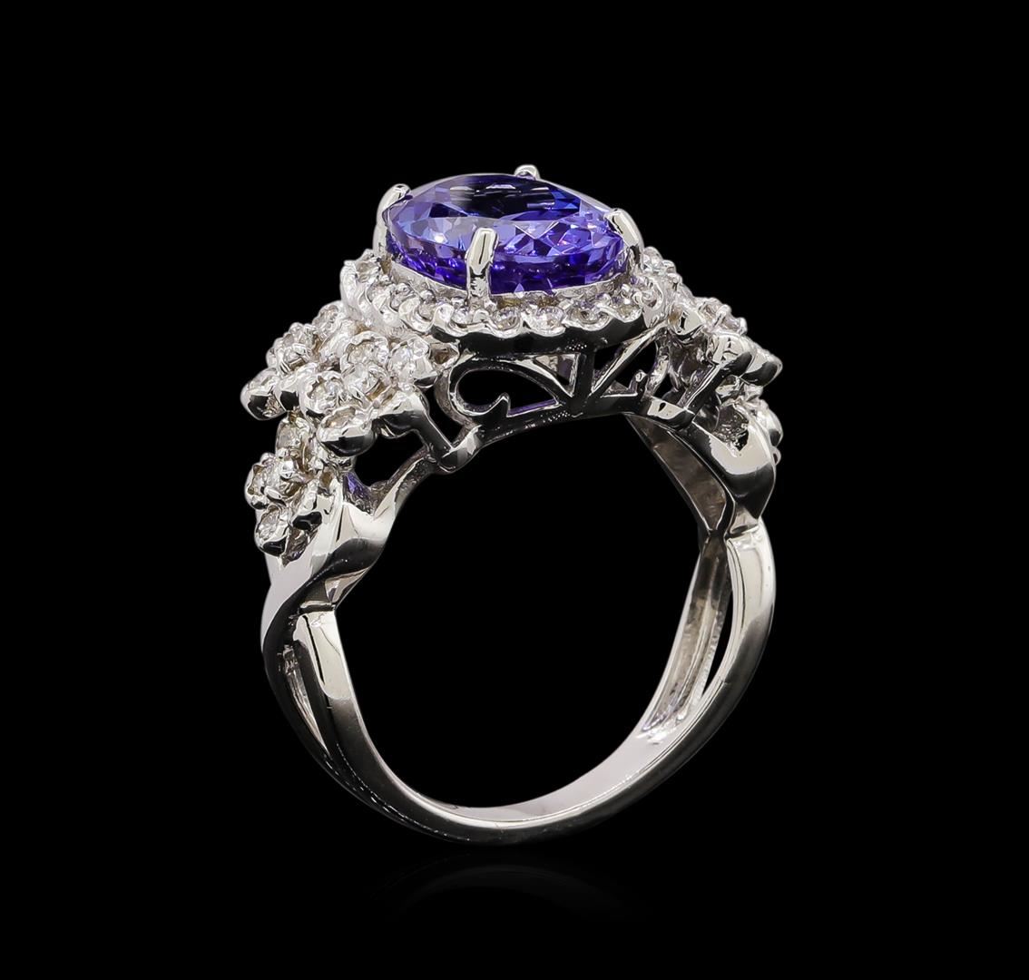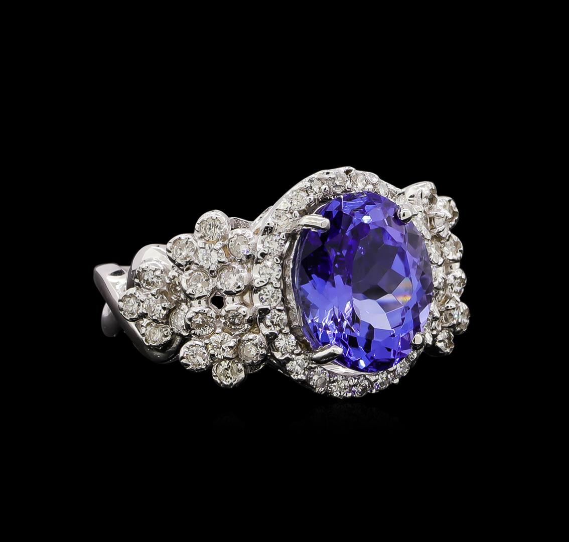 One electronically tested 14KT white gold ladies cast tanzanite and diamond ring with a bright polish finish. Identified with markings of "14K". Condition is new. Containing: One prong set oval modified brilliant cut natural tanzanite, measuring 11.10 x 8.90 x 6.20mm, approximate weight of 4.31ct., clarity is eye clean, type I, medium, moderately strong, violet color, (GIA V 5/4), cut is good. Sixty prong set round brilliant cut diamonds, measuring 1.50 - 1.20 x 0.81mm (depth est.) approximate total weight of 60 Stones = 0.54ct. Clarity: SI-2 to I-2. Color: I - J, Cut is Good. Colored gemstones are presumed to have been subjected to commonly used enhancement processes. All diamonds and colored gemstones are graded in the mounting, unless otherwise stated. Total Weight of Colored Stones 4.31ct. Total Weight of Diamonds 0.54ct. Total Weight of Ring 6.50 grams. GGL Appraised at $4,395.00.