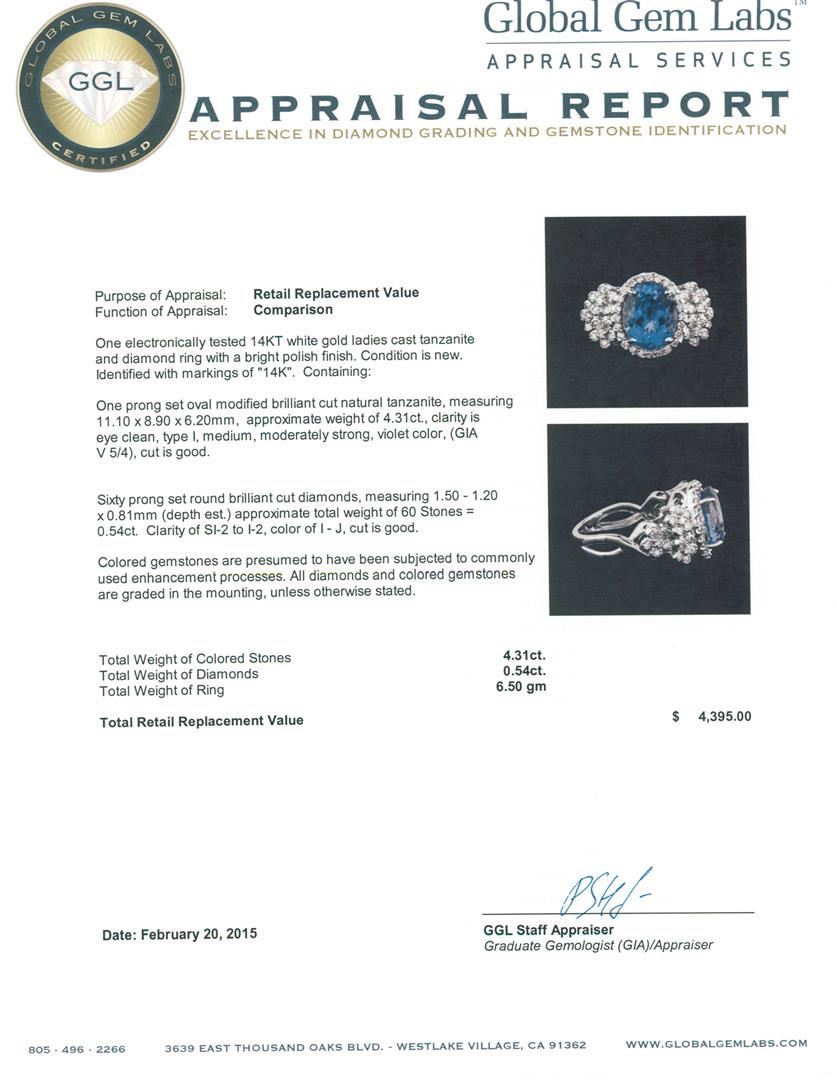 One electronically tested 14KT white gold ladies cast tanzanite and diamond ring with a bright polish finish. Identified with markings of "14K". Condition is new. Containing: One prong set oval modified brilliant cut natural tanzanite, measuring 11.10 x 8.90 x 6.20mm, approximate weight of 4.31ct., clarity is eye clean, type I, medium, moderately strong, violet color, (GIA V 5/4), cut is good. Sixty prong set round brilliant cut diamonds, measuring 1.50 - 1.20 x 0.81mm (depth est.) approximate total weight of 60 Stones = 0.54ct. Clarity: SI-2 to I-2. Color: I - J, Cut is Good. Colored gemstones are presumed to have been subjected to commonly used enhancement processes. All diamonds and colored gemstones are graded in the mounting, unless otherwise stated. Total Weight of Colored Stones 4.31ct. Total Weight of Diamonds 0.54ct. Total Weight of Ring 6.50 grams. GGL Appraised.