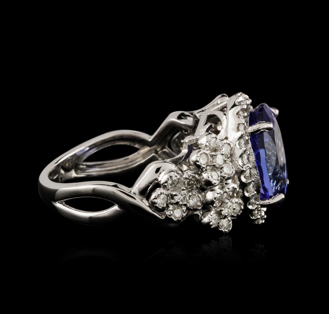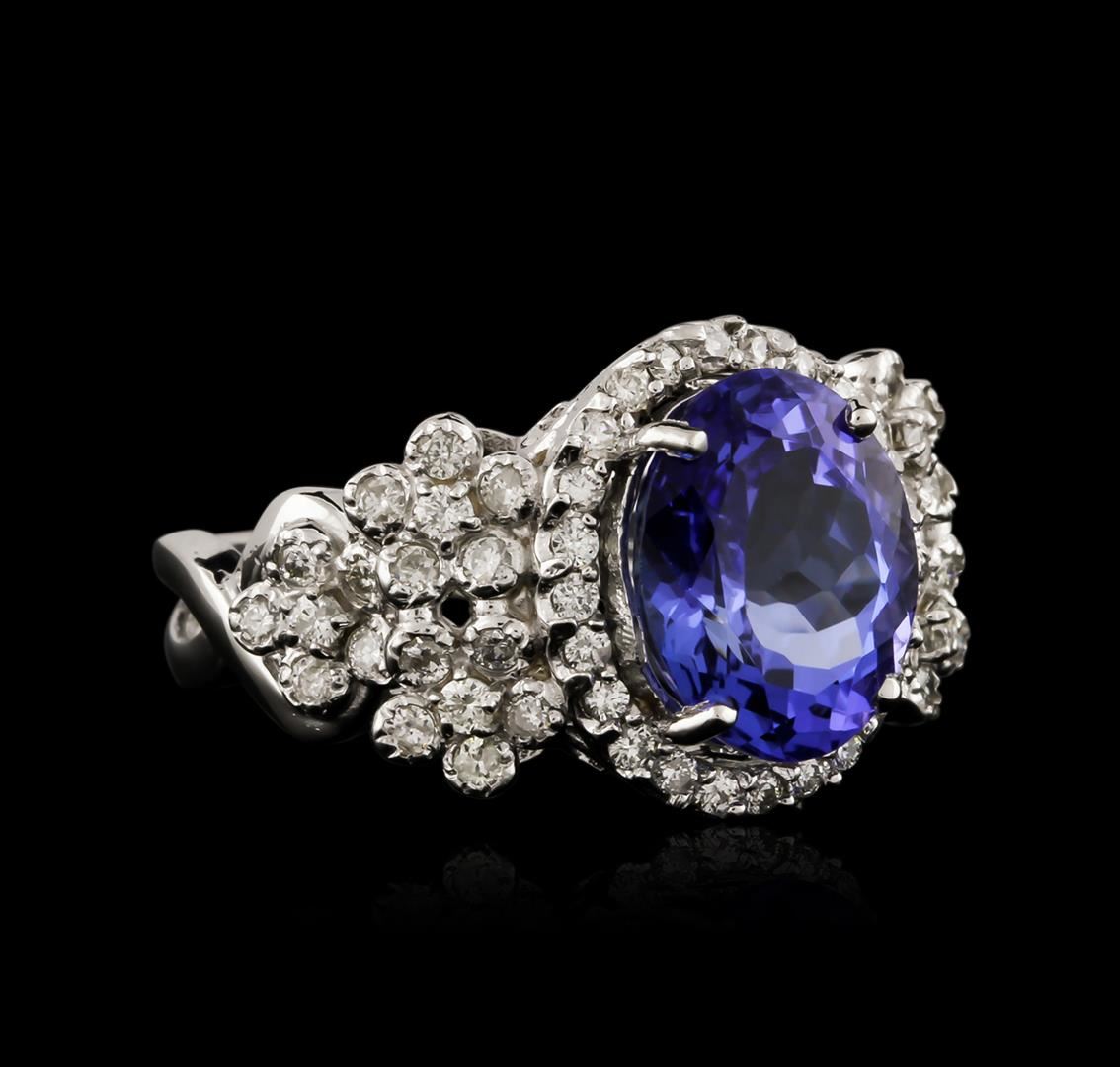 One electronically tested 14KT white gold ladies cast tanzanite and diamond ring with a bright polish finish. Identified with markings of "14K". Condition is new. Containing: One prong set oval modified brilliant cut natural tanzanite, measuring 11.10 x 8.90 x 6.20mm, approximate weight of 4.31ct., clarity is eye clean, type I, medium, moderately strong, violet color, (GIA V 5/4), cut is good. Sixty prong set round brilliant cut diamonds, measuring 1.50 - 1.20 x 0.81mm (depth est.) approximate total weight of 60 Stones = 0.54ct. Clarity: SI-2 to I-2. Color: I - J, Cut is Good. Colored gemstones are presumed to have been subjected to commonly used enhancement processes. All diamonds and colored gemstones are graded in the mounting, unless otherwise stated. Total Weight of Colored Stones 4.31ct. Total Weight of Diamonds 0.54ct. Total Weight of Ring 6.50 grams. GGL Appraised at $4,395.00.