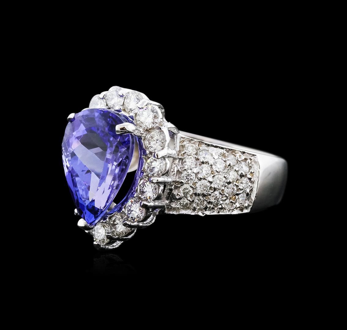 One electronically tested 14KT white gold ladies cast tanzanite and diamond ring with a bright polish finish. Identified with markings of "14K". Condition is new. Containing: One prong set pear modified brilliant cut natural tanzanite, measuring 12.50 x 8.90 x 5.79mm, approximate weight of 4.32ct., clarity is eye clean, type I, medium light, very slightly grayish, violet color, (GIA V 4/3), cut is good. Fifty-One prong set round brilliant cut diamonds, measuring 2.50 - 1.30 x 1.14mm (depth est.) approximate total weight of 51 Stones = 1.28ct. Clarity: SI-1 to I-1. Color: I - J. All diamonds and colored gemstones are graded in the mounting, unless otherwise stated. Colored gemstones are presumed to have been subjected to commonly used enhancement processes. Total Weight of Colored Stones 4.32ct. Total Weight of Diamonds 1.28ct. Total Weight of Ring 6.00. grams. GGL Appraised at $7,255.00.