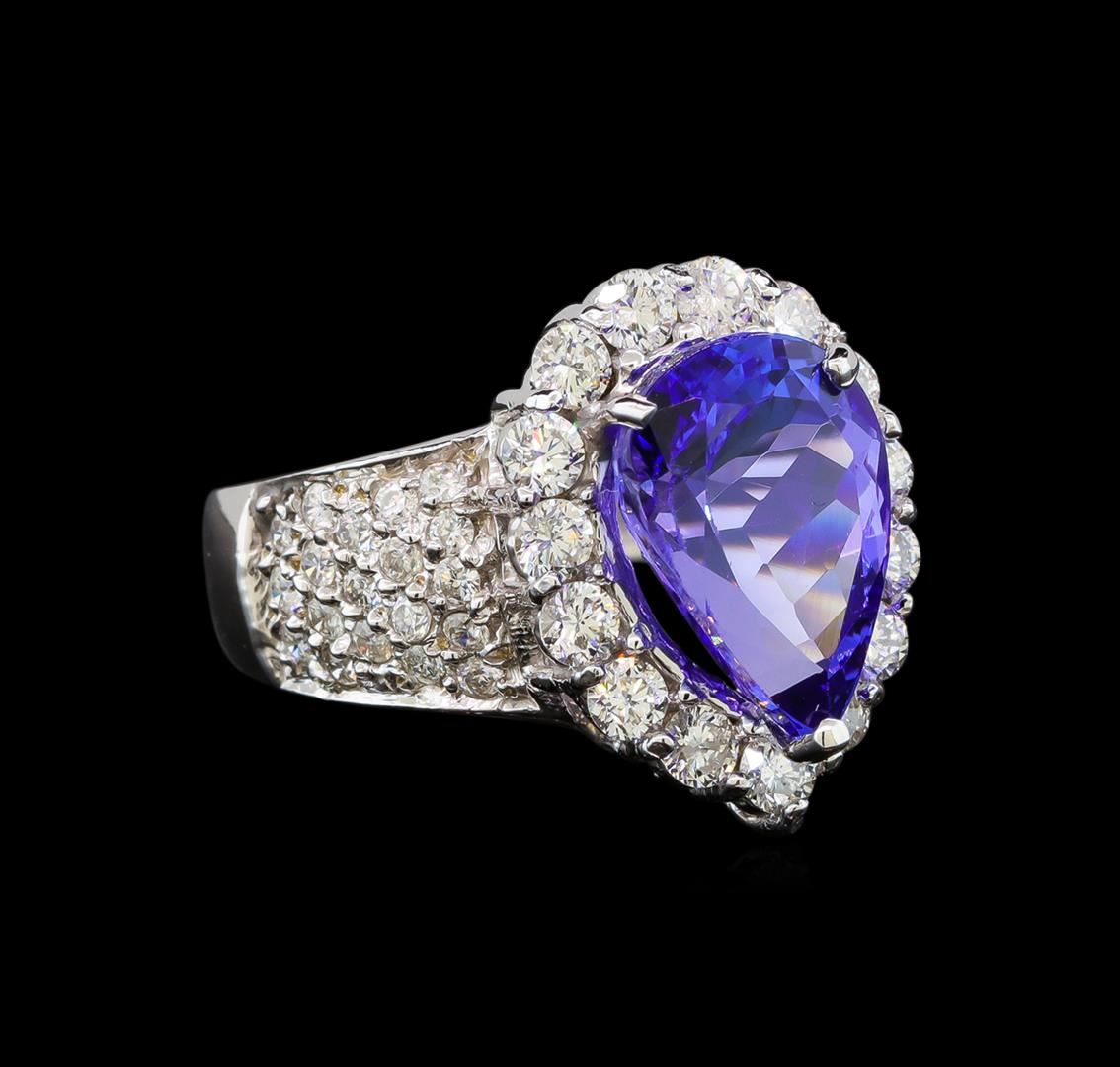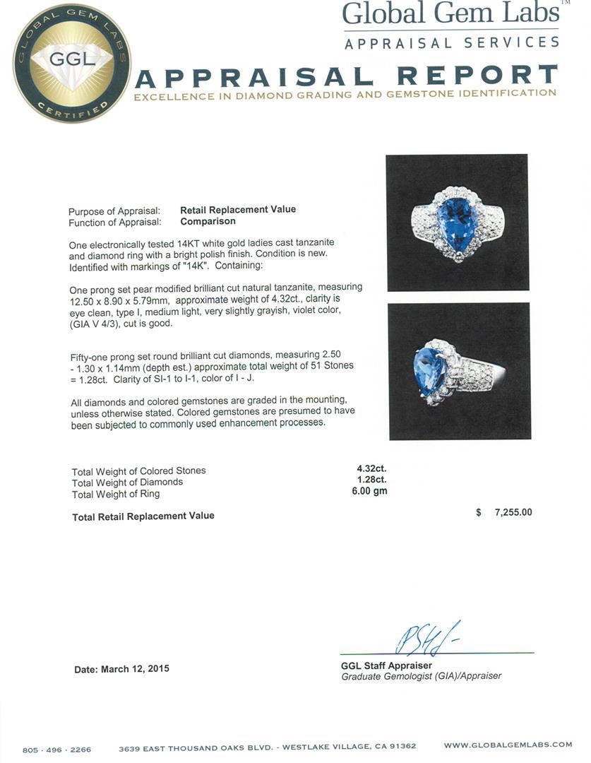 One electronically tested 14KT white gold ladies cast tanzanite and diamond ring with a bright polish finish. Identified with markings of "14K". Condition is new. Containing: One prong set pear modified brilliant cut natural tanzanite, measuring 12.50 x 8.90 x 5.79mm, approximate weight of 4.32ct., clarity is eye clean, type I, medium light, very slightly grayish, violet color, (GIA V 4/3), cut is good. Fifty-One prong set round brilliant cut diamonds, measuring 2.50 - 1.30 x 1.14mm (depth est.) approximate total weight of 51 Stones = 1.28ct. Clarity: SI-1 to I-1. Color: I - J. All diamonds and colored gemstones are graded in the mounting, unless otherwise stated. Colored gemstones are presumed to have been subjected to commonly used enhancement processes. Total Weight of Colored Stones 4.32ct. Total Weight of Diamonds 1.28ct. Total Weight of Ring 6.00. grams. GGL Appraised at $7,255.00.