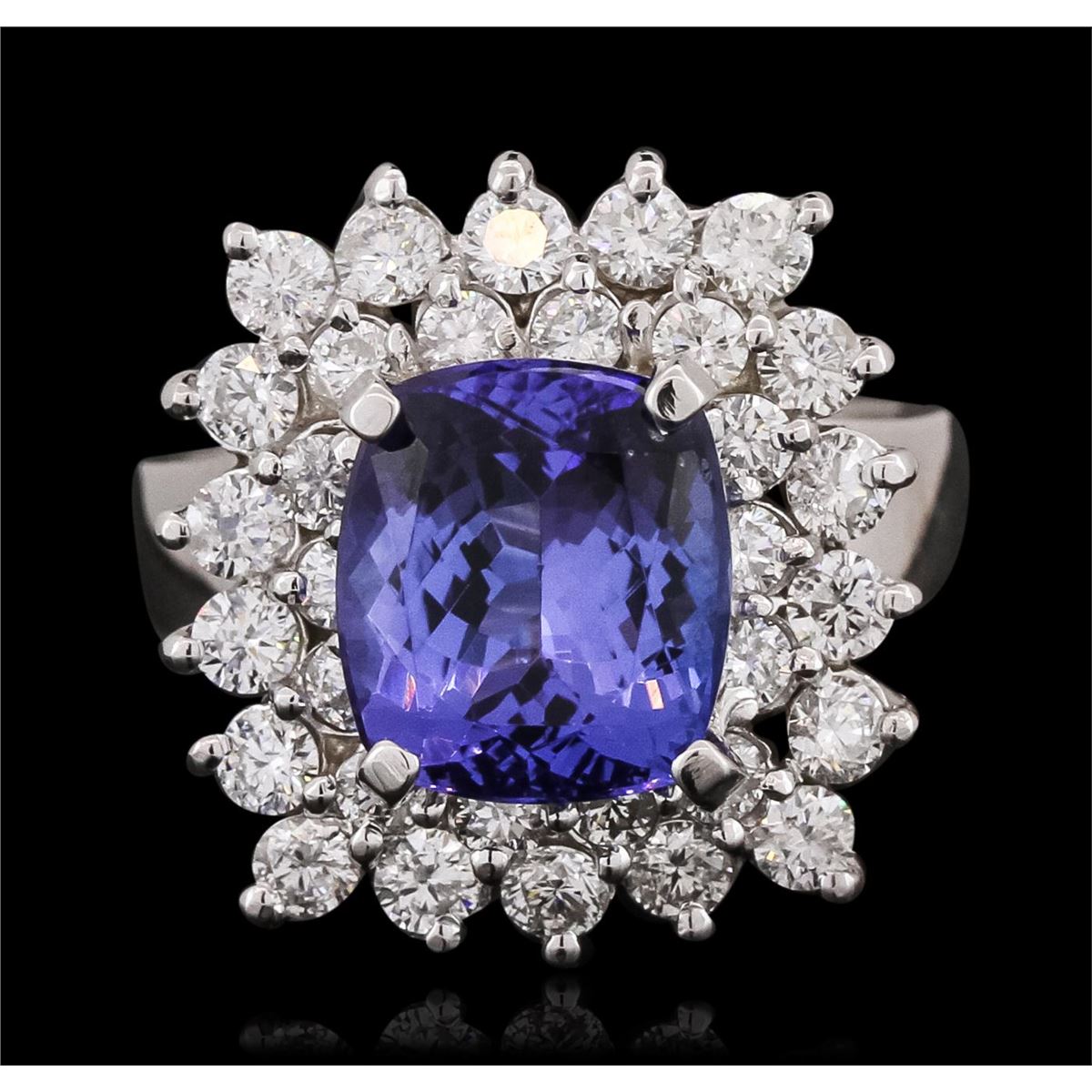 One electronically tested 14KT white gold ladies combination cast & assembled ring with a bright polish finish. Identified with markings of "K14". Condition is new. Containing: One prong set rectangular cushion modified brilliant cut natural tanzanite, measuring 10.00 x 9.20 x 5.98mm, approximate weight of 4.33ct., clarity is eye clean, type I, medium light, moderately strong, bluish violet color, (GIA bV 4/4), cut is good. Thirty-Four prong set round brilliant cut diamonds, measuring 2.50 - 2.00 x 1.35mm (depth est.) approximate total weight of 34 Stones = 1.41ct. Clarity: I-1 to I-2. Color: I - J, Cut is Good. Colored gemstones are presumed to have been subjected to commonly used enhancement processes. All diamonds and colored gemstones are graded in the mounting, unless otherwise stated. Total Weight of Colored Stones 4.33ct. Total Weight of Diamonds 1.41ct. Total Weight of Ring 9.40 grams. GGL Appraised at $11,675.00.
