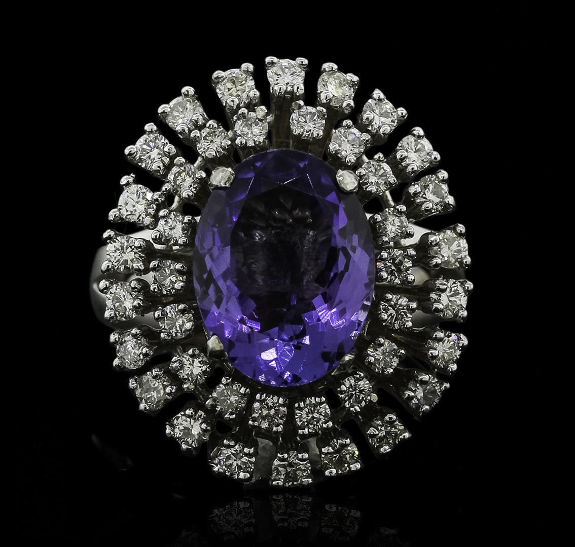 One electronically tested 14KT white gold ladies cast tanzanite and diamond ring with a bright polish finish. The featured tanzanite is set within a two tiered diamond bezel, completed by a three millimeter wide band. Identified with markings of "K14". Condition is new, good workmanship. Containing: One prong set oval mixed cut natural tanzanite, measuring 12.55 x 9.55 x 5.00mm, 6% bulge factor, approximate weight of 4.34ct., clarity is eye clean, type I, medium dark, very slightly grayish, bluish violet color, (GIA bV 6/3), cut is good. Transmitting light with no distortion, transparent. Graded in the setting. Tanzanite is a very rare gemstone that is only found in the country of Tanzania. Originally discovered in 1967. Tiffany & Company, named the stone Tanzanite. It is found in the Usumburu Mountains that border the Umba Valley of northern Tanzania. Tanzanite occurs in gray, brown, violet, blue, reddish-purple, & green. The gem is interesting because of its exceptional pleochroism. Rotated in different directions a tanzanite will exhibit multiple changes of color. Tanzanite has a low tolerance to ultrasonic cleaning, and should not be cleaned using this method. Forty prong set round brilliant cut diamonds, measuring 2.00 - 1.90 x 1.17mm (depth est.) approximate total weight of 40 Stones = 1.18ct. Graded in the setting. Clarity: SI-1 to I-1. Color: H - J. Total Weight of Colored Stones 4.34ct. Total Weight of Diamonds 1.18ct. Total Weight of Ring 12.10 grams. AIG Appraised at $15,420.00.