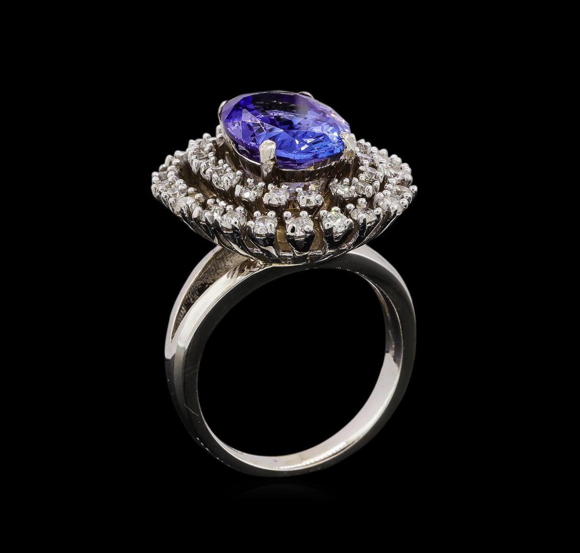 One electronically tested 14KT white gold ladies cast tanzanite and diamond ring with a bright polish finish. The featured tanzanite is set within a two tiered diamond bezel, completed by a three millimeter wide band. Identified with markings of "K14". Condition is new, good workmanship. Containing: One prong set oval mixed cut natural tanzanite, measuring 12.55 x 9.55 x 5.00mm, 6% bulge factor, approximate weight of 4.34ct., clarity is eye clean, type I, medium dark, very slightly grayish, bluish violet color, (GIA bV 6/3), cut is good. Transmitting light with no distortion, transparent. Graded in the setting. Tanzanite is a very rare gemstone that is only found in the country of Tanzania. Originally discovered in 1967. Tiffany & Company, named the stone Tanzanite. It is found in the Usumburu Mountains that border the Umba Valley of northern Tanzania. Tanzanite occurs in gray, brown, violet, blue, reddish-purple, & green. The gem is interesting because of its exceptional pleochroism. Rotated in different directions a tanzanite will exhibit multiple changes of color. Tanzanite has a low tolerance to ultrasonic cleaning, and should not be cleaned using this method. Forty prong set round brilliant cut diamonds, measuring 2.00 - 1.90 x 1.17mm (depth est.) approximate total weight of 40 Stones = 1.18ct. Graded in the setting. Clarity: SI-1 to I-1. Color: H - J. Total Weight of Colored Stones 4.34ct. Total Weight of Diamonds 1.18ct. Total Weight of Ring 12.10 grams. AIG Appraised at $15,420.00.