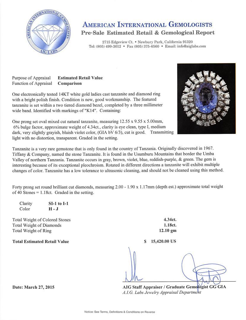 One electronically tested 14KT white gold ladies cast tanzanite and diamond ring with a bright polish finish. The featured tanzanite is set within a two tiered diamond bezel, completed by a three millimeter wide band. Identified with markings of "K14". Condition is new, good workmanship. Containing: One prong set oval mixed cut natural tanzanite, measuring 12.55 x 9.55 x 5.00mm, 6% bulge factor, approximate weight of 4.34ct., clarity is eye clean, type I, medium dark, very slightly grayish, bluish violet color, (GIA bV 6/3), cut is good. Transmitting light with no distortion, transparent. Graded in the setting. Tanzanite is a very rare gemstone that is only found in the country of Tanzania. Originally discovered in 1967. Tiffany & Company, named the stone Tanzanite. It is found in the Usumburu Mountains that border the Umba Valley of northern Tanzania. Tanzanite occurs in gray, brown, violet, blue, reddish-purple, & green. The gem is interesting because of its exceptional pleochroism. Rotated in different directions a tanzanite will exhibit multiple changes of color. Tanzanite has a low tolerance to ultrasonic cleaning, and should not be cleaned using this method. Forty prong set round brilliant cut diamonds, measuring 2.00 - 1.90 x 1.17mm (depth est.) approximate total weight of 40 Stones = 1.18ct. Graded in the setting. Clarity: SI-1 to I-1. Color: H - J. Total Weight of Colored Stones 4.34ct. Total Weight of Diamonds 1.18ct. Total Weight of Ring 12.10 grams. AIG Appraised at $15,420.00.