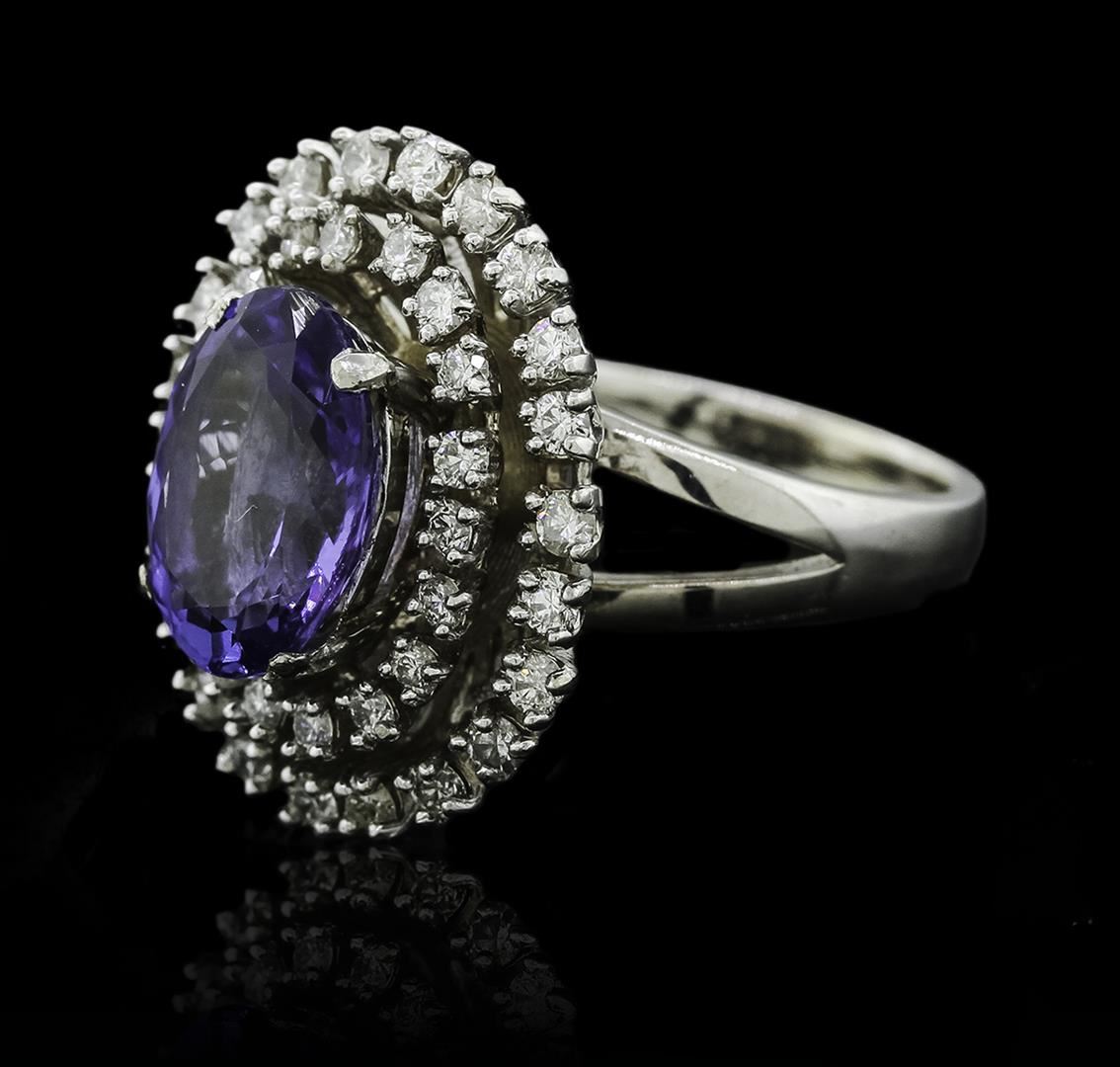 One electronically tested 14KT white gold ladies cast tanzanite and diamond ring with a bright polish finish. The featured tanzanite is set within a two tiered diamond bezel, completed by a three millimeter wide band. Identified with markings of "K14". Condition is new, good workmanship. Containing: One prong set oval mixed cut natural tanzanite, measuring 12.55 x 9.55 x 5.00mm, 6% bulge factor, approximate weight of 4.34ct., clarity is eye clean, type I, medium dark, very slightly grayish, bluish violet color, (GIA bV 6/3), cut is good. Transmitting light with no distortion, transparent. Graded in the setting. Tanzanite is a very rare gemstone that is only found in the country of Tanzania. Originally discovered in 1967. Tiffany & Company, named the stone Tanzanite. It is found in the Usumburu Mountains that border the Umba Valley of northern Tanzania. Tanzanite occurs in gray, brown, violet, blue, reddish-purple, & green. The gem is interesting because of its exceptional pleochroism. Rotated in different directions a tanzanite will exhibit multiple changes of color. Tanzanite has a low tolerance to ultrasonic cleaning, and should not be cleaned using this method. Forty prong set round brilliant cut diamonds, measuring 2.00 - 1.90 x 1.17mm (depth est.) approximate total weight of 40 Stones = 1.18ct. Graded in the setting. Clarity: SI-1 to I-1. Color: H - J. Total Weight of Colored Stones 4.34ct. Total Weight of Diamonds 1.18ct. Total Weight of Ring 12.10 grams. AIG Appraised at $15,420.00.