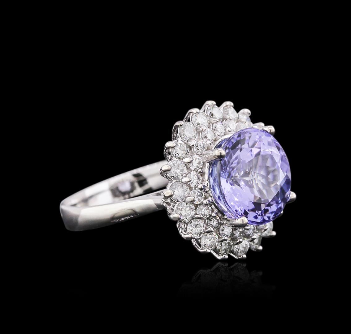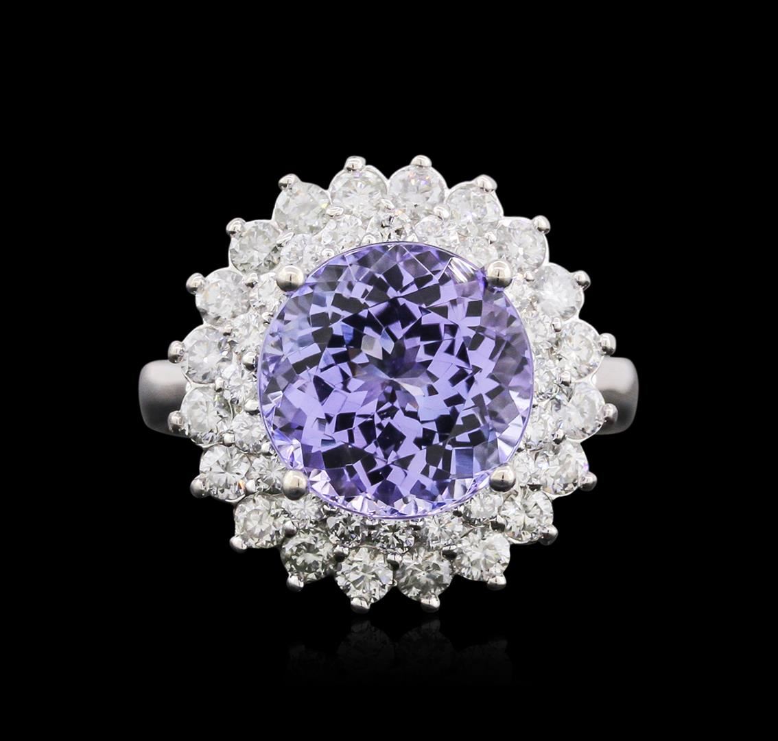 One electronically tested 14KT white gold ladies cast tanzanite and diamond ring with a bright polish finish. Identified with markings of "14K". Condition is new. Containing: One prong set round modified brilliant cut natural tanzanite, measuring 10.00. - 10.00. x 6.50 mm, approximate weight of 4.36ct., clarity is eye clean, type I, medium light, very slightly grayish, violet color, (GIA V 4/3), cut is good. Forty prong set round brilliant cut diamonds, measuring 2.00. - 1.50 x 1.05mm (depth est.) approximate total weight of 40 Stones = 0.78ct. Clarity: SI-1 to I-1. Color: I - J, Cut is Good. Colored gemstones are presumed to have been subjected to commonly used enhancement processes. All diamonds and colored gemstones are graded in the mounting, unless otherwise stated. Total Weight of Colored Stones 4.36ct. Total Weight of Diamonds 0.78ct. Total Weight of Ring 6.50 grams. GGL Appraised at $5,125.00.