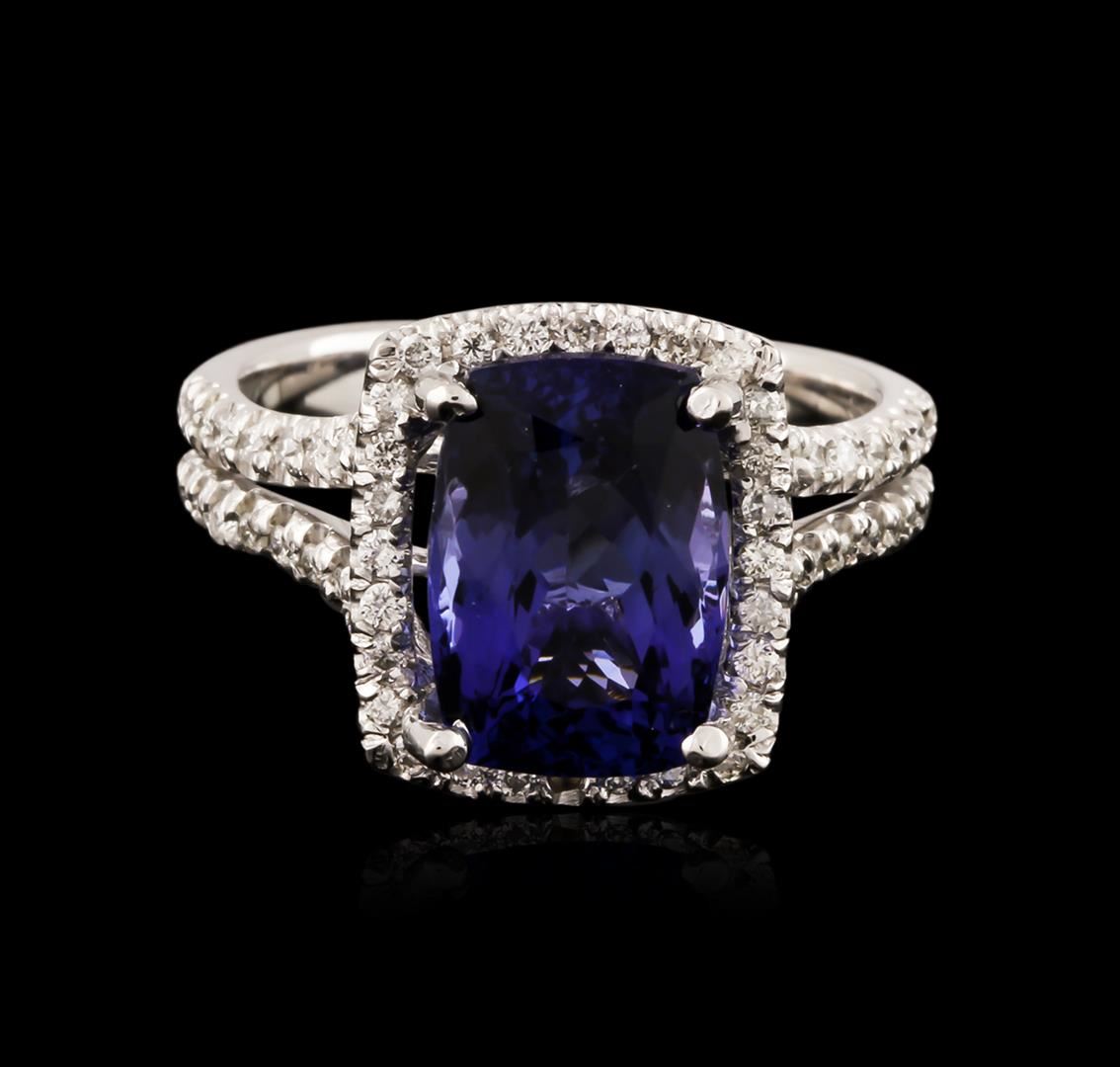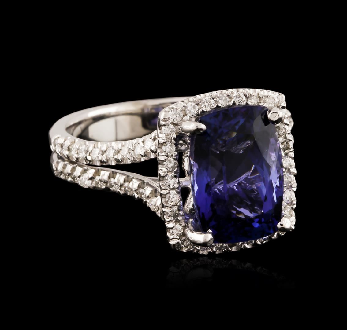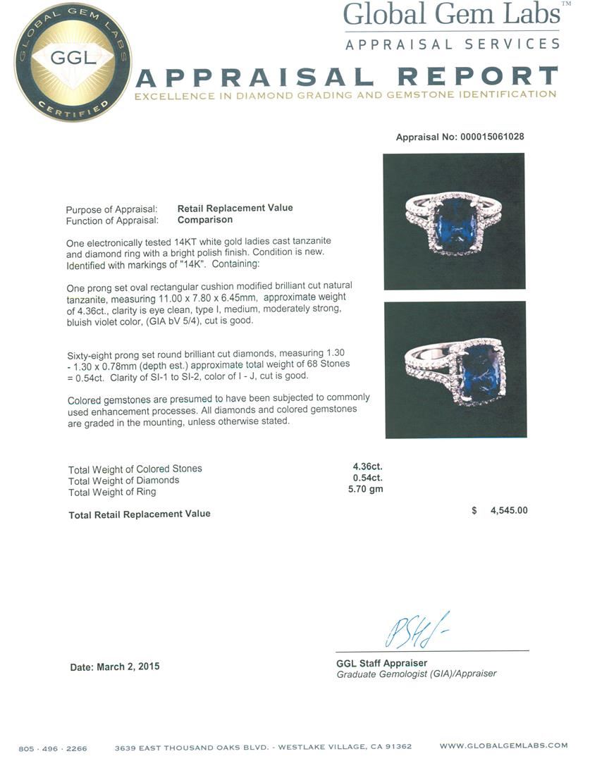 One electronically tested 14KT white gold ladies cast tanzanite and diamond ring with a bright polish finish. Identified with markings of "14K". Condition is new. Containing: One prong set oval rectangular cushion modified brilliant cut natural tanzanite, measuring 11.00 x 7.80 x 6.45mm, approximate weight of 4.36ct., clarity is eye clean, type I, medium, moderately strong, bluish violet color, (GIA bV 5/4), cut is good. Sixty-Eight prong set round brilliant cut diamonds, measuring 1.30 - 1.30 x 0.78mm (depth est.) approximate total weight of 68 Stones = 0.54ct. Clarity: SI-1 to SI-2. Color: I - J, Cut is Good. Colored gemstones are presumed to have been subjected to commonly used enhancement processes. All diamonds and colored gemstones are graded in the mounting, unless otherwise stated. Total Weight of Colored Stones 4.36ct. Total Weight of Diamonds 0.54ct. Total Weight of Ring 5.70 grams. GGL Appraised at $4,545.00.