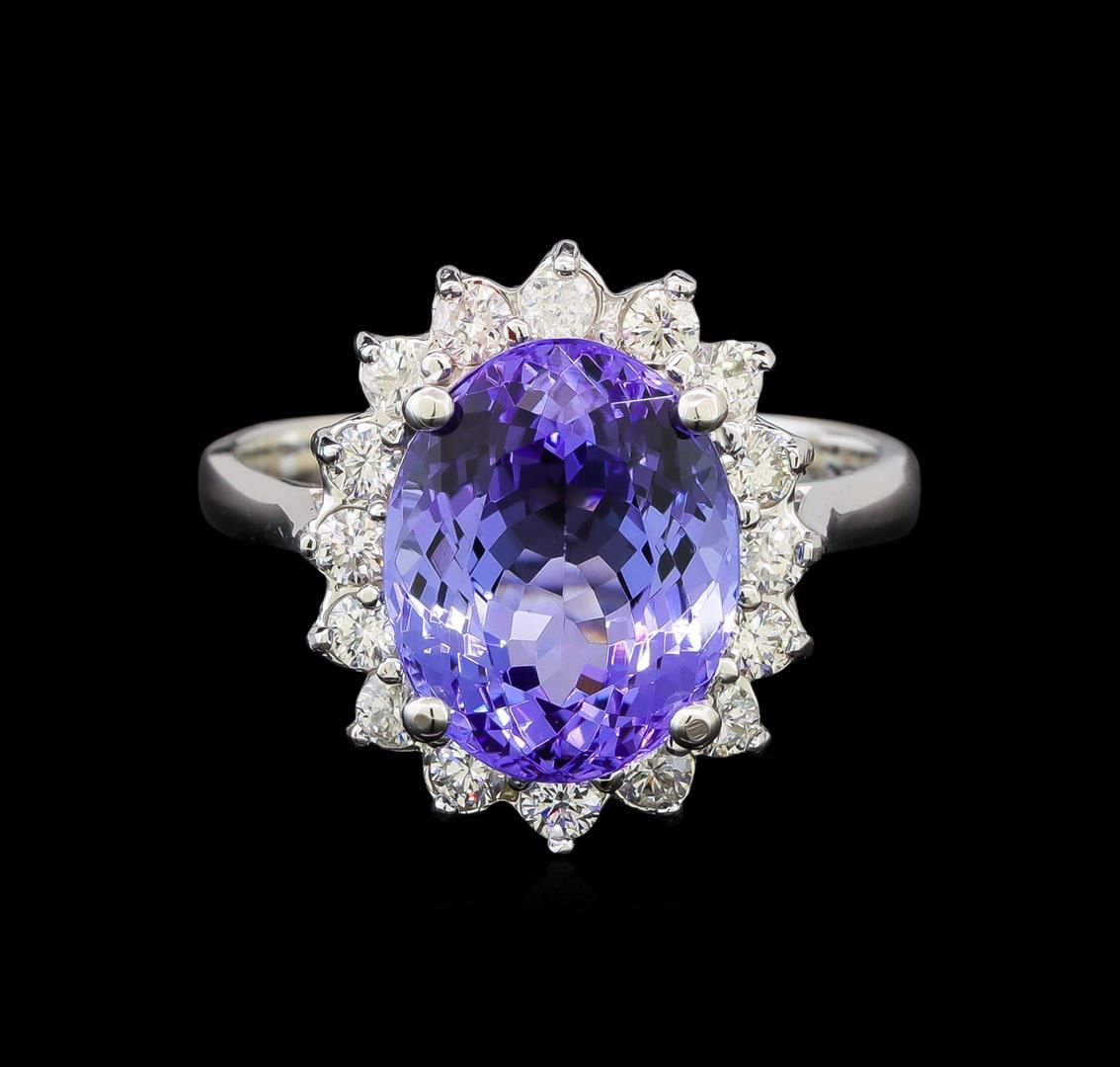 One electronically tested 14KT white gold ladies cast tanzanite and diamond ring with a bright polish finish. Identified with markings of "K14". Condition is new. Containing: One prong set oval modified brilliant cut natural tanzanite, measuring 11.80 x 9.00 x 5.85mm, approximate weight of 4.37ct., clarity is eye clean, type I, medium light, slightly grayish, violet color, (GIA V 4/2), cut is good. Sixteen prong set round brilliant cut diamonds, measuring 1.90 - 1.90 x 1.14mm (depth est.) approximate total weight of 16 Stones = 0.40ct. Clarity: SI-1. Color: H - I, Cut is Good. Colored gemstones are presumed to have been subjected to commonly used enhancement processes. All diamonds and colored gemstones are graded in the mounting, unless otherwise stated. Total Weight of Colored Stones 4.37ct. Total Weight of Diamonds 0.40ct. Total Weight of Ring 5.10 grams. GGL Appraised at $4,110.00.