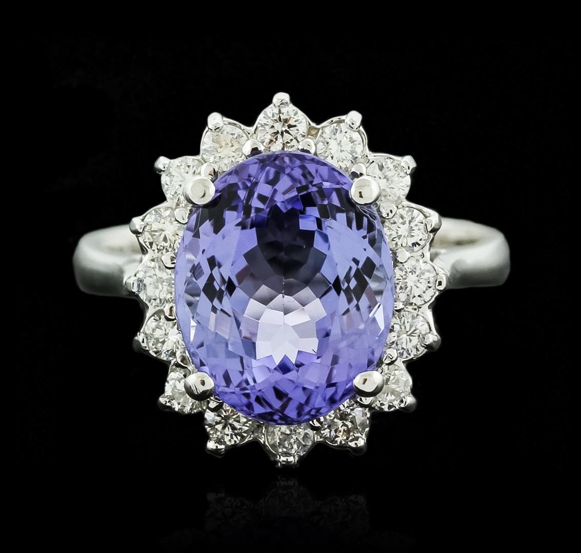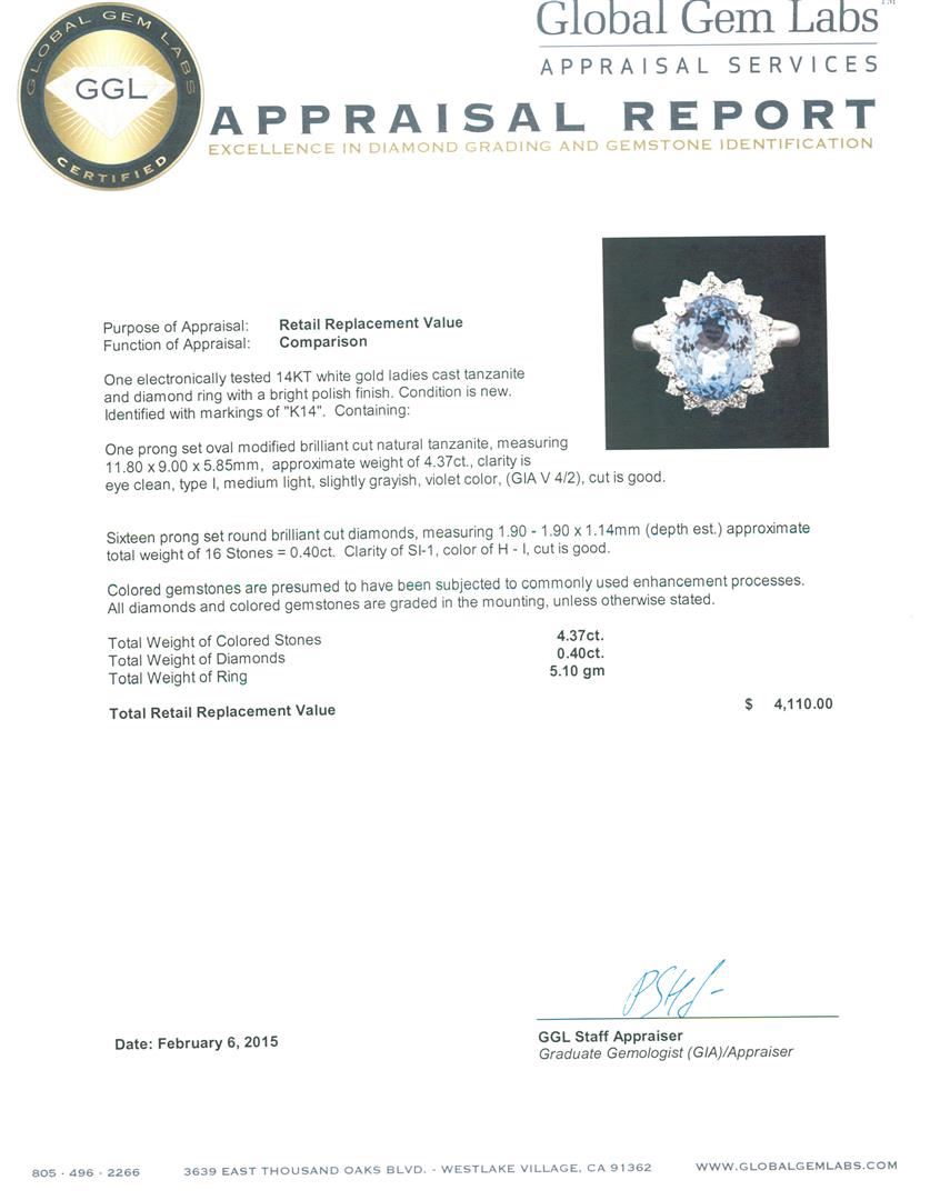 One electronically tested 14KT white gold ladies cast tanzanite and diamond ring with a bright polish finish. Identified with markings of "K14". Condition is new. Containing: One prong set oval modified brilliant cut natural tanzanite, measuring 11.80 x 9.00 x 5.85mm, approximate weight of 4.37ct., clarity is eye clean, type I, medium light, slightly grayish, violet color, (GIA V 4/2), cut is good. Sixteen prong set round brilliant cut diamonds, measuring 1.90 - 1.90 x 1.14mm (depth est.) approximate total weight of 16 Stones = 0.40ct. Clarity: SI-1. Color: H - I, Cut is Good. Colored gemstones are presumed to have been subjected to commonly used enhancement processes. All diamonds and colored gemstones are graded in the mounting, unless otherwise stated. Total Weight of Colored Stones 4.37ct. Total Weight of Diamonds 0.40ct. Total Weight of Ring 5.10 grams. GGL Appraised at $4,110.00.