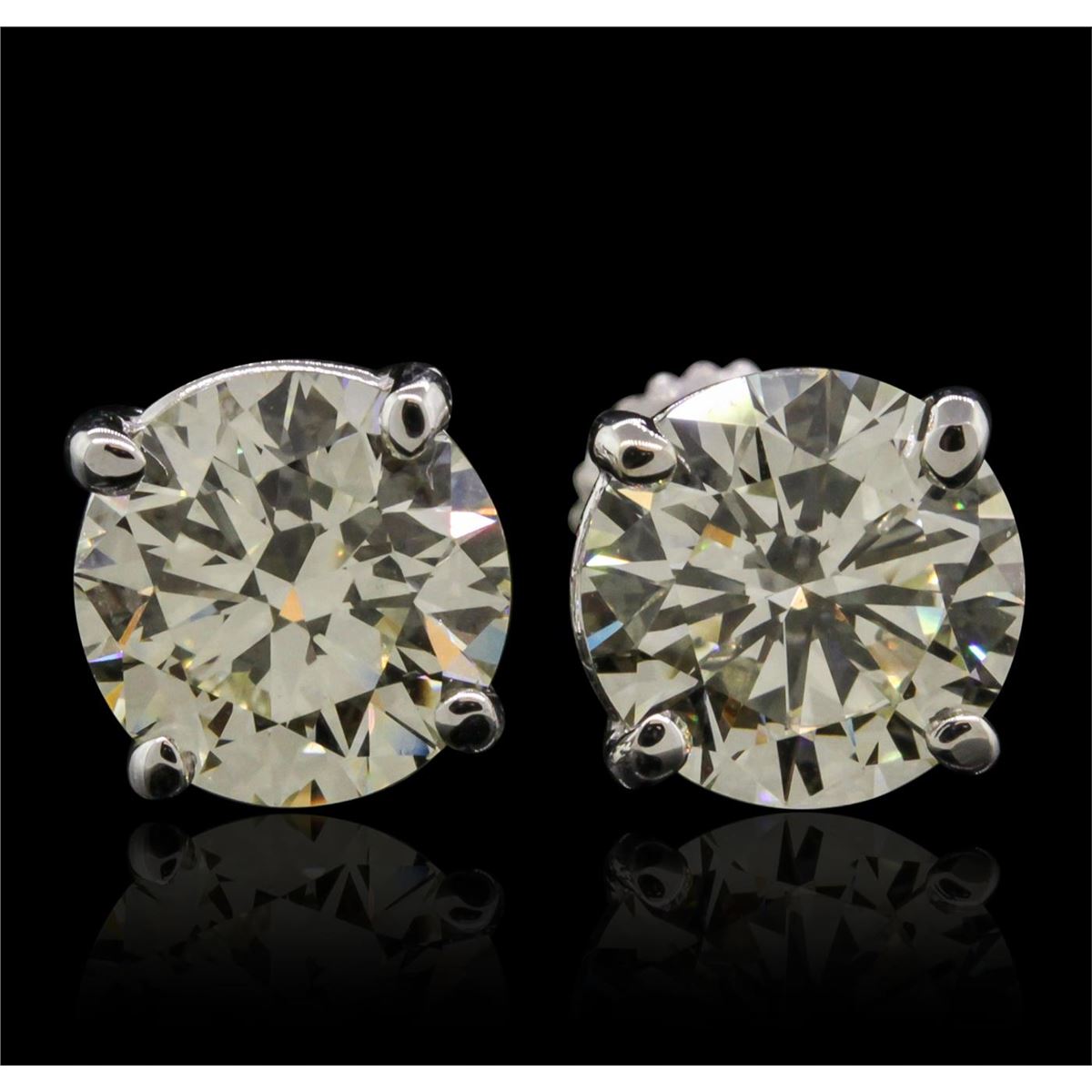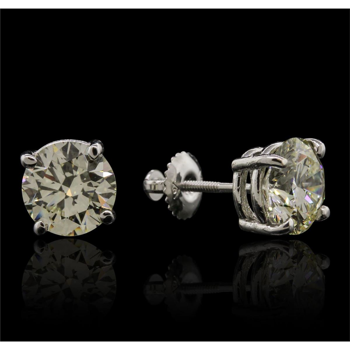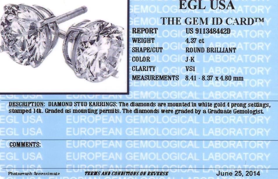 One pair electronically tested 14KT white gold Ladies cast stud earrings with screw backs with a bright polish finish. Condition is new. Identified with markings of "14K". Containing: One prong set round brilliant cut diamond, measuring 8.31 - 8.31 x 5.05mm (depth est.) approximate weight of 2.20ct. Clarity: VS-1. Color: J, Cut is Good. One prong set round brilliant cut diamond, measuring 8.27 - 8.27 x 4.96mm (depth est.) approximate weight of 2.17ct. Clarity: VS-1. Color: K, Cut is Good. EGL USA GEM ID# US 911348442D. All diamonds are graded in the mounting, unless otherwise stated. Total Weight of Diamonds 4.37ct. Total Weight of Earrings 3.20 grams. GGL Appraised at $101,625.00.
