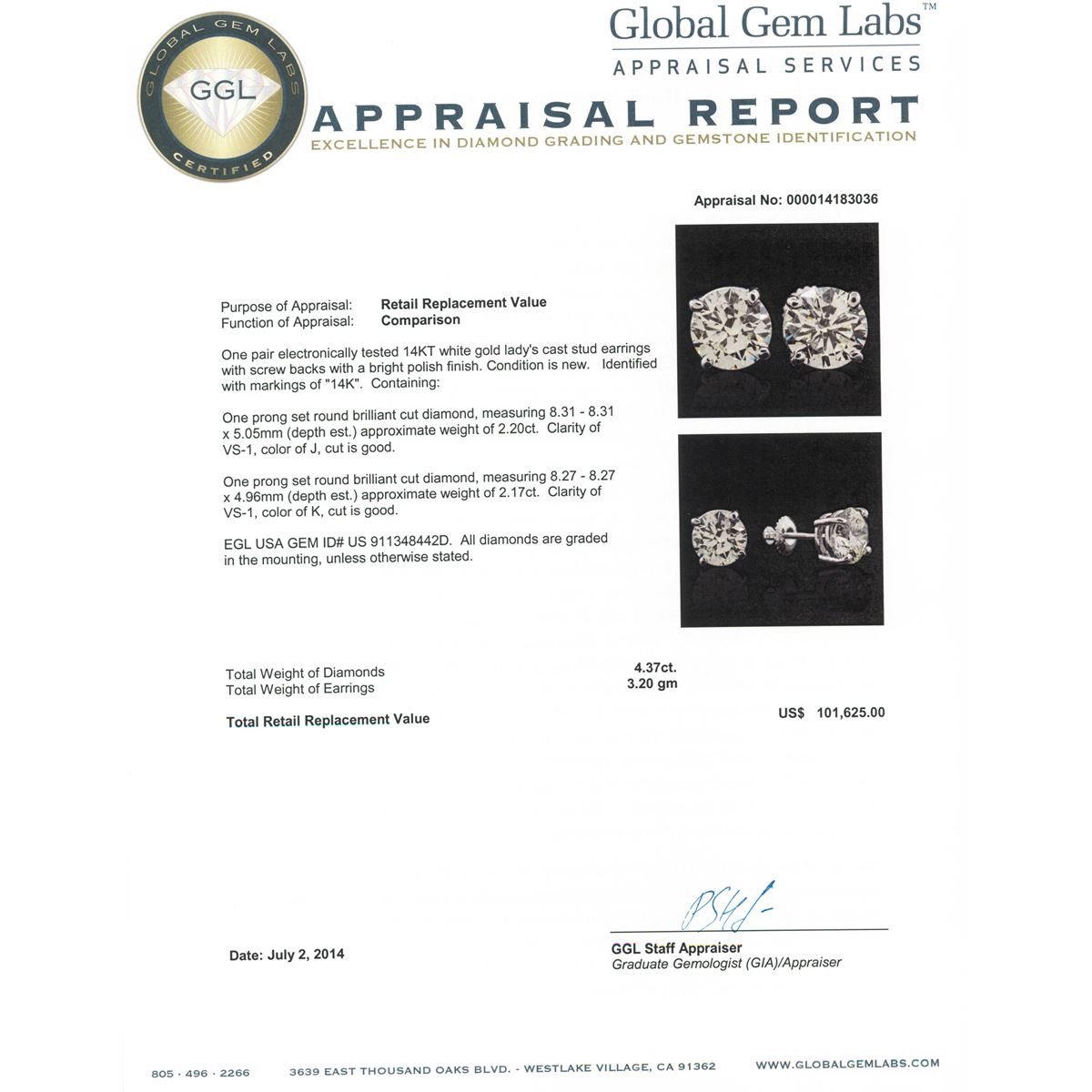 One pair electronically tested 14KT white gold Ladies cast stud earrings with screw backs with a bright polish finish. Condition is new. Identified with markings of "14K". Containing: One prong set round brilliant cut diamond, measuring 8.31 - 8.31 x 5.05mm (depth est.) approximate weight of 2.20ct. Clarity: VS-1. Color: J, Cut is Good. One prong set round brilliant cut diamond, measuring 8.27 - 8.27 x 4.96mm (depth est.) approximate weight of 2.17ct. Clarity: VS-1. Color: K, Cut is Good. EGL USA GEM ID# US 911348442D. All diamonds are graded in the mounting, unless otherwise stated. Total Weight of Diamonds 4.37ct. Total Weight of Earrings 3.20 grams. GGL Appraised at $101,625.00.