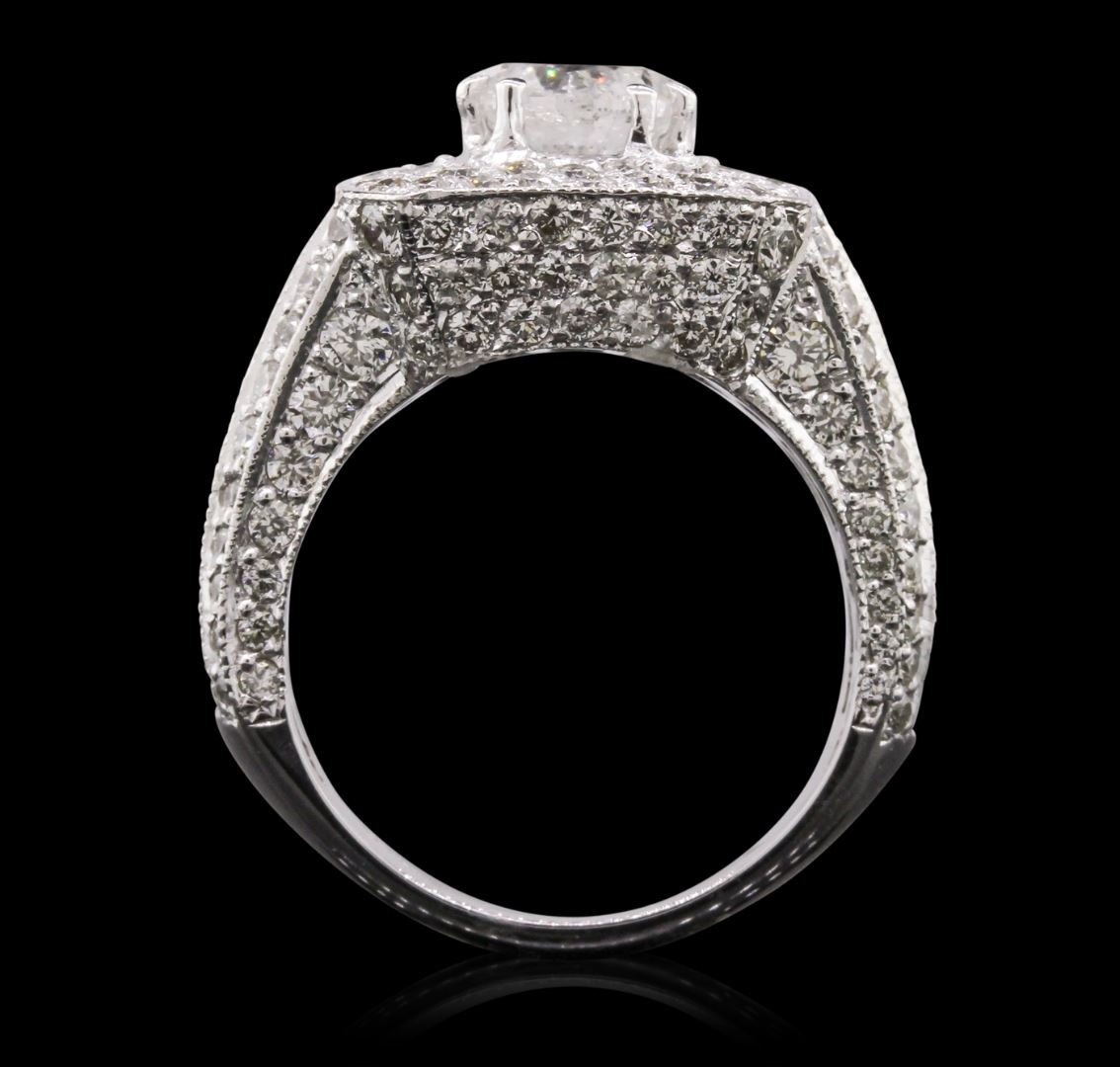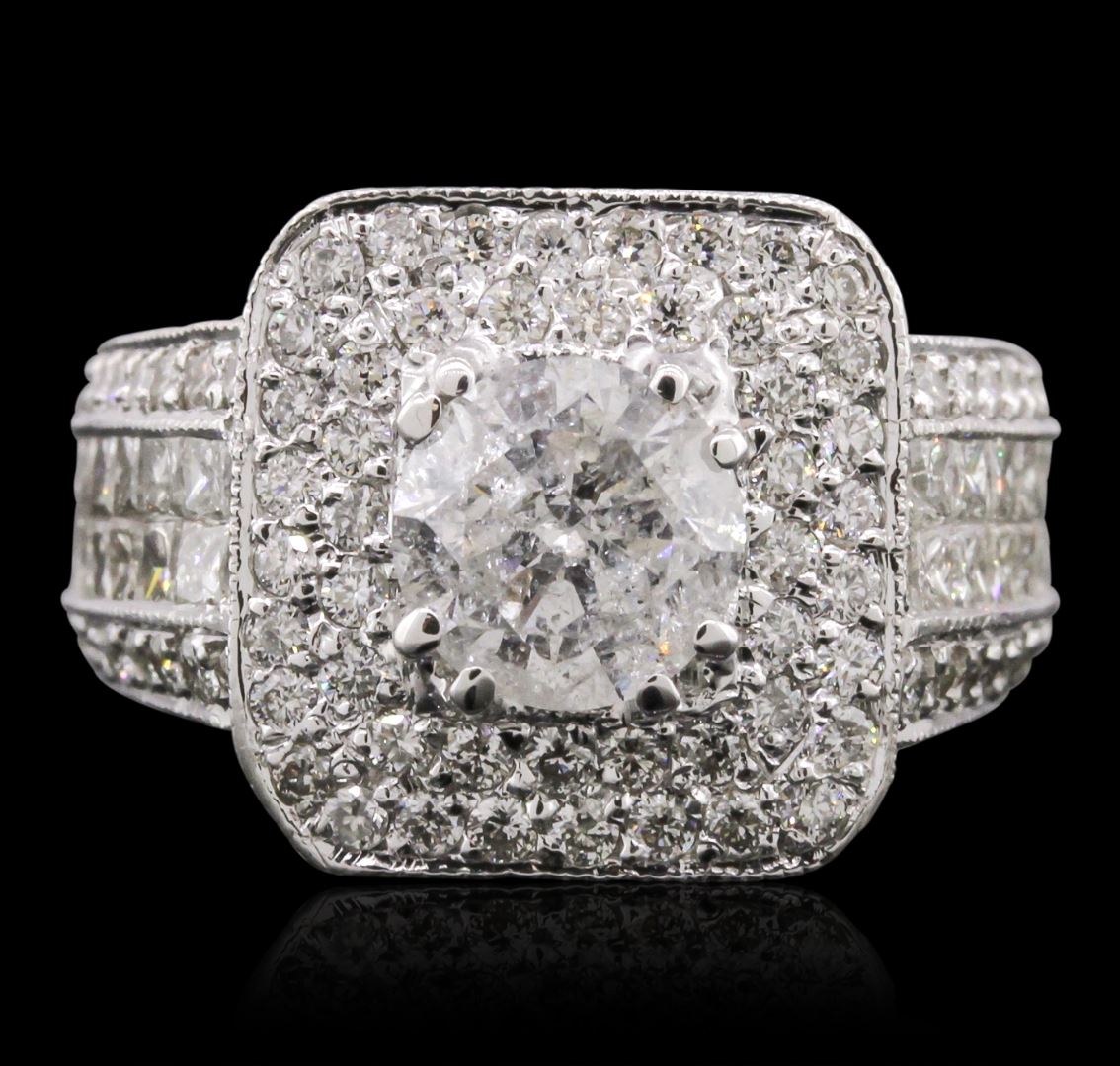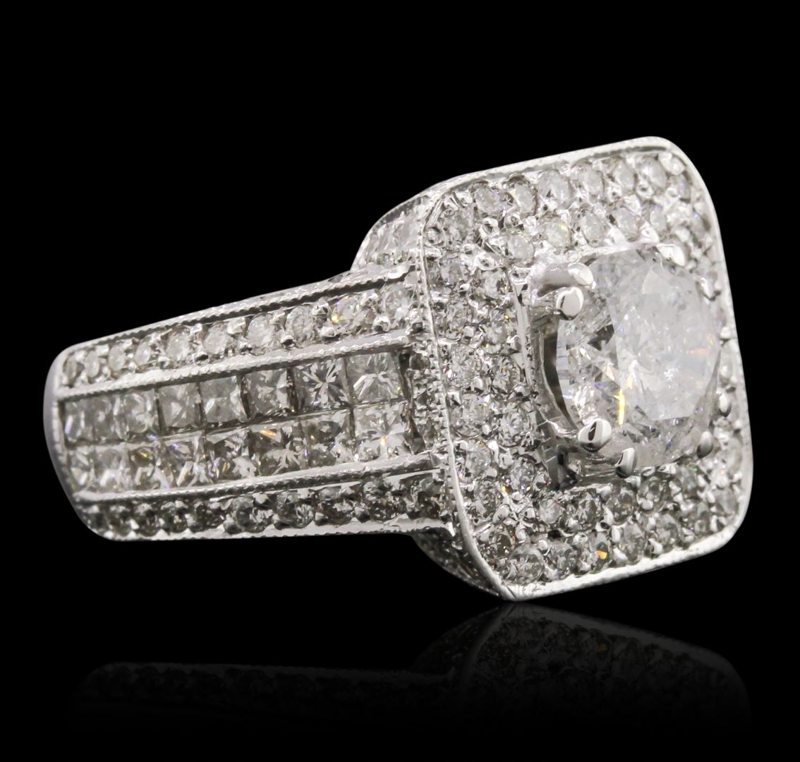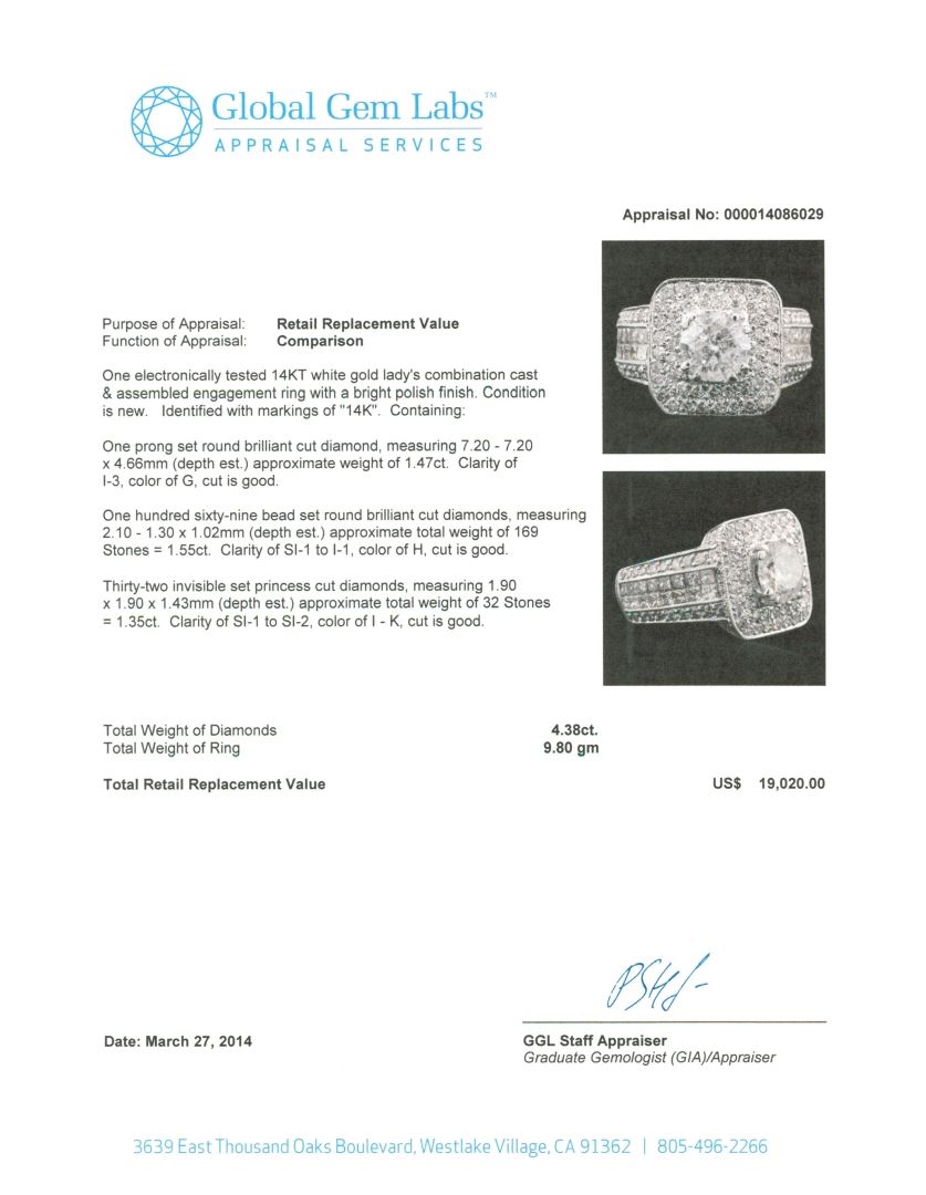 One electronically tested 14KT white gold Ladies combination cast & assembled engagement ring with a bright polish finish. Condition is new. Identified with markings of "14K". Containing: One prong set round brilliant cut diamond, measuring 7.20 - 7.20 x 4.66mm (depth est.) approximate weight of 1.47ct. Clarity: I-3. Color: G, Cut is Good. One Hundred Sixty-Nine bead set round brilliant cut diamonds, measuring 2.10 - 1.30 x 1.02mm (depth est.) approximate. Total Weight of 169 Stones = 1.55ct. Clarity: SI-1 to I-1. Color: H, Cut is Good. Thirty-Two invisible set princess cut diamonds, measuring 1.90 x 1.90 x 1.43mm (depth est.) approximate. Total Weight of 32 Stones = 1.35ct. Clarity: SI-1 to SI-2. Color: I - K, Cut is Good. Total Weight of Diamonds 4.38ct. Total Weight of Ring 9.80 grams. GGL Appraised at $19,020.00.