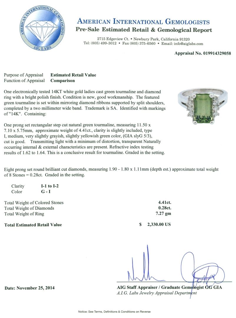 One electronically tested 14KT white gold ladies cast green tourmaline and diamond ring with a bright polish finish. The featured green tourmaline is set within mirroring diamond ribbons supported by split shoulders, completed by a two millimeter wide band. Trademark is SA. Identified with markings of "14K". Condition is new, good workmanship. Containing: One prong set rectangular step cut natural green tourmaline, measuring 11.50 x 7.10 x 5.75mm, approximate weight of 4.41ct., clarity is slightly included, type I, medium, very slightly grayish, slightly yellowish green color, (GIA slyG 5/3), cut is good. Transmitting light with a minimum of distortion, transparent Naturally occurring internal & external characteristics are present. Refractive index testing results of 1.62 to 1.64. This is a conclusive result for tourmaline. Graded in the setting. Eight prong set round brilliant cut diamonds, measuring 1.90 - 1.80 x 1.11mm (depth est.) approximate total weight of 8 Stones = 0.28ct. Graded in the setting. Clarity: I-1 to I-2. Color: G - I. Total Weight of Colored Stones 4.41ct. Total Weight of Diamonds 0.28ct. Total Weight of Ring 7.27 grams. AIG Appraised at $2,330.00.