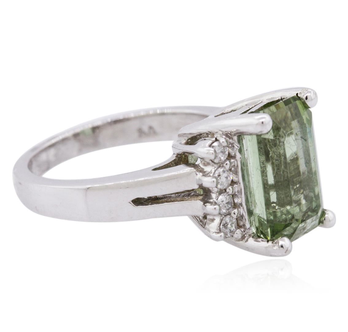 One electronically tested 14KT white gold ladies cast green tourmaline and diamond ring with a bright polish finish. The featured green tourmaline is set within mirroring diamond ribbons supported by split shoulders, completed by a two millimeter wide band. Trademark is SA. Identified with markings of "14K". Condition is new, good workmanship. Containing: One prong set rectangular step cut natural green tourmaline, measuring 11.50 x 7.10 x 5.75mm, approximate weight of 4.41ct., clarity is slightly included, type I, medium, very slightly grayish, slightly yellowish green color, (GIA slyG 5/3), cut is good. Transmitting light with a minimum of distortion, transparent Naturally occurring internal & external characteristics are present. Refractive index testing results of 1.62 to 1.64. This is a conclusive result for tourmaline. Graded in the setting. Eight prong set round brilliant cut diamonds, measuring 1.90 - 1.80 x 1.11mm (depth est.) approximate total weight of 8 Stones = 0.28ct. Graded in the setting. Clarity: I-1 to I-2. Color: G - I. Total Weight of Colored Stones 4.41ct. Total Weight of Diamonds 0.28ct. Total Weight of Ring 7.27 grams. AIG Appraised at $2,330.00.