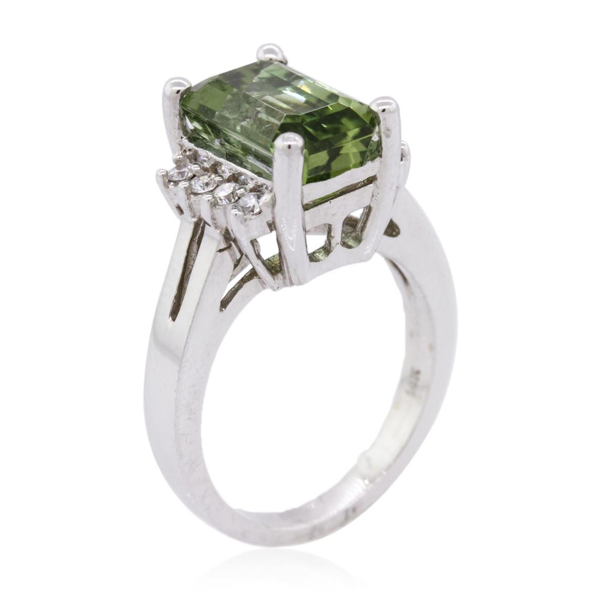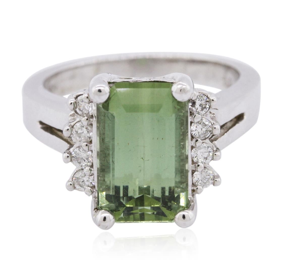 One electronically tested 14KT white gold ladies cast green tourmaline and diamond ring with a bright polish finish. The featured green tourmaline is set within mirroring diamond ribbons supported by split shoulders, completed by a two millimeter wide band. Trademark is SA. Identified with markings of "14K". Condition is new, good workmanship. Containing: One prong set rectangular step cut natural green tourmaline, measuring 11.50 x 7.10 x 5.75mm, approximate weight of 4.41ct., clarity is slightly included, type I, medium, very slightly grayish, slightly yellowish green color, (GIA slyG 5/3), cut is good. Transmitting light with a minimum of distortion, transparent Naturally occurring internal & external characteristics are present. Refractive index testing results of 1.62 to 1.64. This is a conclusive result for tourmaline. Graded in the setting. Eight prong set round brilliant cut diamonds, measuring 1.90 - 1.80 x 1.11mm (depth est.) approximate total weight of 8 Stones = 0.28ct. Graded in the setting. Clarity: I-1 to I-2. Color: G - I. Total Weight of Colored Stones 4.41ct. Total Weight of Diamonds 0.28ct. Total Weight of Ring 7.27 grams. AIG Appraised at $2,330.00.