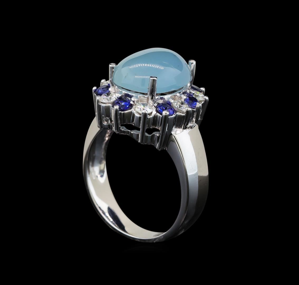 One electronically tested 14KT white gold ladies cast aquamarine, sapphire and diamond ring with a bright polish finish. Identified with markings of "14K". Condition is new. Containing: One prong set oval cabochon cut natural aquamarine, measuring 12.10 x 9.50 x 6.18mm, approximate weight of 4.43ct., clarity is severely included, type I, medium light, very slightly grayish, blue color, (GIA B 4/3), cut is good. Seven prong set round modified brilliant cut natural blue sapphires, measuring 2.50 - 2.50 x 1.63 mm, approximate total weight of 0.68ct., clarity is eye clean, type II, medium, moderately strong, blue color, (GIA B 5/4), cut is very good. Seven prong set round brilliant cut diamonds, measuring 2.50 - 2.50 x 1.50mm (depth est.) approximate total weight of 7 Stones = 0.50ct. Clarity: SI-1 to SI-2. Color: I - J, Cut is Good. Colored gemstones are presumed to have been subjected to commonly used enhancement processes. All diamonds and colored gemstones are graded in the mounting, unless otherwise stated. Total Weight of Colored Stones 5.11ct. Total Weight of Diamonds 0.50ct. Total Weight of Ring 7.20 grams. GGL Appraised at $3,550.00.