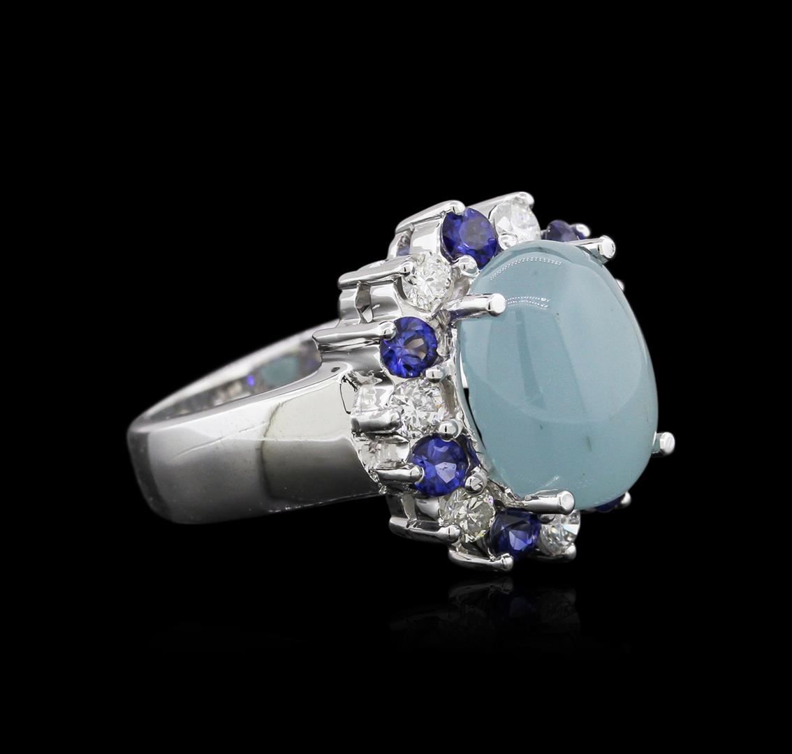 One electronically tested 14KT white gold ladies cast aquamarine, sapphire and diamond ring with a bright polish finish. Identified with markings of "14K". Condition is new. Containing: One prong set oval cabochon cut natural aquamarine, measuring 12.10 x 9.50 x 6.18mm, approximate weight of 4.43ct., clarity is severely included, type I, medium light, very slightly grayish, blue color, (GIA B 4/3), cut is good. Seven prong set round modified brilliant cut natural blue sapphires, measuring 2.50 - 2.50 x 1.63 mm, approximate total weight of 0.68ct., clarity is eye clean, type II, medium, moderately strong, blue color, (GIA B 5/4), cut is very good. Seven prong set round brilliant cut diamonds, measuring 2.50 - 2.50 x 1.50mm (depth est.) approximate total weight of 7 Stones = 0.50ct. Clarity: SI-1 to SI-2. Color: I - J, Cut is Good. Colored gemstones are presumed to have been subjected to commonly used enhancement processes. All diamonds and colored gemstones are graded in the mounting, unless otherwise stated. Total Weight of Colored Stones 5.11ct. Total Weight of Diamonds 0.50ct. Total Weight of Ring 7.20 grams. GGL Appraised at $3,550.00.