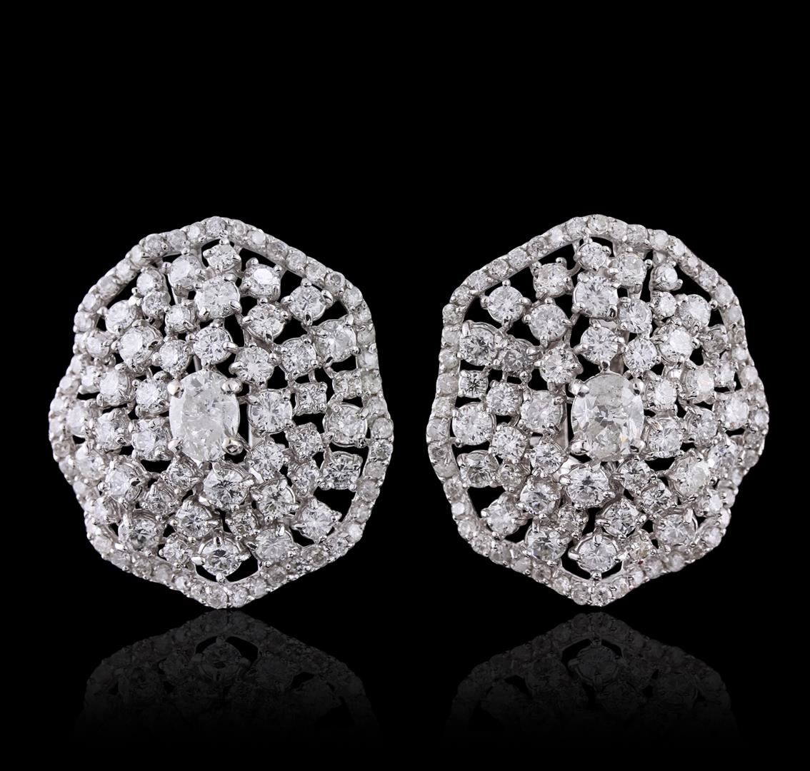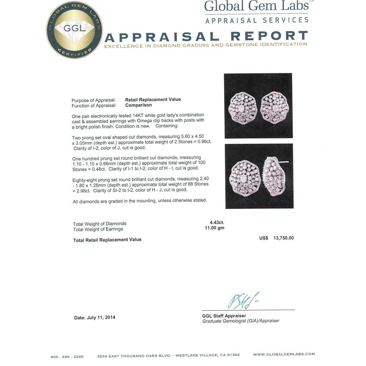 One pair electronically tested 14KT white gold Ladies combination cast & assembled earrings with Omega clip backs with posts with a bright polish finish. Condition is new. Containing: Two prong set oval shaped cut diamonds, measuring 5.60 x 4.50 x 3.05mm (depth est.) approximate. Total Weight of 2 Stones = 0.96ct. Clarity: I-2. Color: J, Cut is Good. One Hundred prong set round brilliant cut diamonds, measuring 1.10 - 1.10 x 0.66mm (depth est.) approximate. Total Weight of 100 Stones = 0.48ct. Clarity: I-1 to I-2. Color: H - I, Cut is Good. Eighty-Eight prong set round brilliant cut diamonds, measuring 2.40 - 1.80 x 1.26mm (depth est.) approximate. Total Weight of 88 Stones = 2.98ct. Clarity: SI-2 to I-2. Color: H - J, Cut is Good. All diamonds are graded in the mounting, unless otherwise stated. Total Weight of Diamonds 4.43ct. Total Weight of Earrings 11.00 grams. GGL Appraised at $13,750.00.